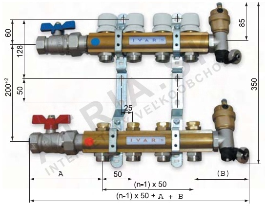 - zostava obsahuje: rozdeľovač s regulačnými šróbeniami, zberač s uzatváracími ventilmi, upevňovacie konzoly, 2 ks guľových uzáverov so šróbením, 2 ks ukončenia s automatickým odvzdušňovacím ventilom a otočným vypúšťacím ventilom