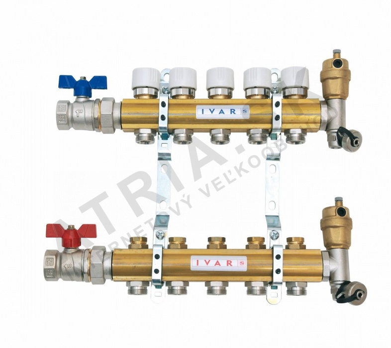 - zostava obsahuje: rozdeľovač s regulačnými šróbeniami, zberač s uzatváracími ventilmi, upevňovacie konzoly, 2 ks guľových uzáverov so šróbením, 2 ks ukončenia s automatickým odvzdušňovacím ventilom a otočným vypúšťacím ventilom