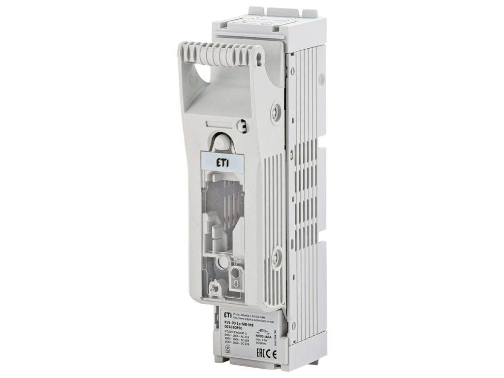 Řadový odpínač KVL-00 M8-M8 1-pólový, In = 160A, Un = 690V DC / 440V DC, pro pojistky NH00, montáž na panel. Parametry: - Velikost: NH00 - Jmenovitý proud (A): 160 - Počet pólů: 1 - Jmenovité AC napětí (V): 690 - Jmenovité DC napětí (V): 440 - Třída použití: AC-23B / DC-22B - Připojení: M8 - Typ: KVLDodatočné parametre