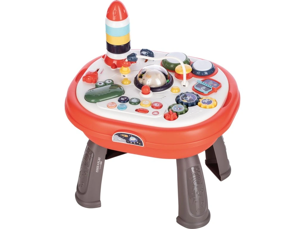Zábavný interaktivní stoleček pro vaše nejmenší. Hračka umožňuje dítěti rozvíjet smyslové vnímání, jemnou motoriku, zručnost, rozlišování tvarů, barev, zvuků. Aktivuje se červeným tlačítkem, po zapnutí začne vesele hrát a blikat, dvojstupňové ovládání hlasitosti, panel hrací části se dá vyjmout a otočit - z druhé strany lze použít jako podložku na lego, může sloužit i jako úložný box na hračky, zatáhnutím za knoflík uprostřed stolečku se roztočí kočička v kopuli, ozubená kolečka, hrkající korálky, stavění věže, spousta tlačítek a knoflíků s veselými funkcemi. Pro provoz výrobku je potřeba 3 x 1,5V baterie AA (nejsou součástí výrobku).Dodatočné parametre