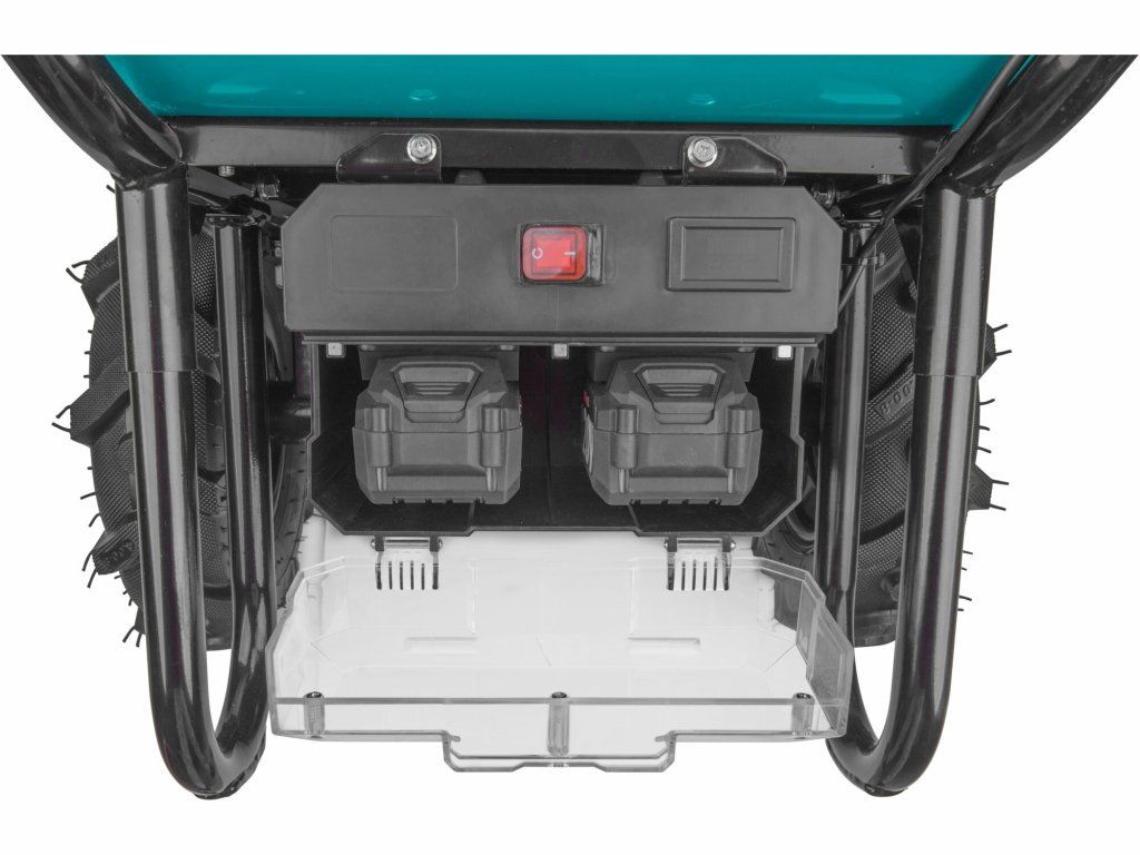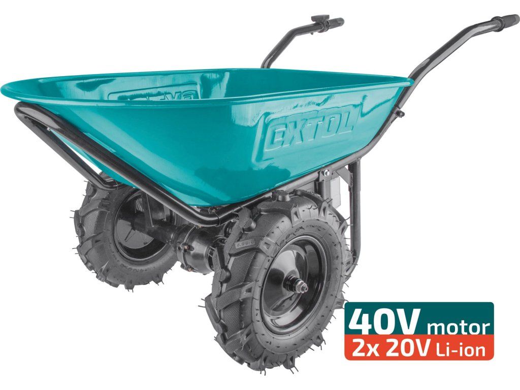 Dvojkolesový fúrik je určený na prepravu tuhých, sypkých alebo hustých materiálov. Elektrický pohon podstatne urýchľuje prepravu a zároveň znižuje únavu počas obsluhy, čo zvyšuje produktivitu práce. Použitie Li-ion batérie výrazne znižuje hmotnosť fúrika oproti modelom, ktoré sú poháňané olovenými batériami. Na pravej rukoväti sa nachádza ovládač, kde je možné pomocou palca nastaviť okamžitú rýchlosť pohybu, voliť jazdu dopredu alebo dozadu, aktivovať brzdu, normálnu alebo Turbo rýchlosť. Pre bežnú prevádzku sa používa normálna rýchlosť, Turbo je možné použiť pri jazde do kopca, v ťažkom teréne alebo pri preprave ťažšieho nákladu. Fúrik je poháňaný najmodernejším bezuhlíkovým 40V motorom. Tento nový typ motora má vyššiu životnosť, je výkonnejší a má menšiu spotrebu elektrickej energie ako klasické motory s uhlíkovými kefami. Ak je to nutné, je možné motor kompletne vypnúť a používať fúrik len na ručný pohon. Zabudovaná prevodovka s diferenciálom výrazne zlepšuje priestupnosť terénom a výkon motora pri jazde do kopca. Vďaka umiestneniu ťažiska nákladu nad osou kolies je väčšina hmotnosti nákladu umiestnená na kolesách a obsluha takmer nič nenesie. Elektrická brzda sa používa ak je potrebné zamedziť pohybu fúrika na mieste. Kolesá s hlbokou vzorkou do terénu poskytujú dobrú trakciu. Fúrik je dodávaný s kovovou korbou s objemom 100l, lisovanou z jedného kusa plechu. Pre prepravu pevného objemnejšieho nákladu (napr. krabice, polená...) je možné dokúpiť rámovú konštrukciu, ktorá sa priskrutkuje namiesto korby. Elektronika fúrika má krytie IP64, čo mu umožňuje dočasnú prácu vo vlhkom prostredí, prípadne umývanie prúdom vody, nie je ale určený na trvalú prevádzku alebo skladovanie vo vlhkom prostredí. Pre jednoduchšiu prepravu v aute je možné sklopiť rúčky, takže sa fúrik zmestí aj do menšieho auta. Zdrojom elektrickej energie sú silné Share20V akumulátory, ktoré sa predávajú samostatne. Z dôvodu vysokého odberu je nutné použiť 6Ah alebo 8Ah verziu. Výhodou použitia Share20V akumulátorov je, že keď fúrik nepoužívate, môžete ich tiež používať v našom neustále rozširujúcom sa sortimente náradia používajúceho rovnaký typ akumulátora. Vyberateľné batérie umožňujú ich ľahké nabíjanie a skladovanie v suchom a zateplenom prostredí, čo je veľmi dôležité pre ich životnosť. Batérie majú ochranu proti vybitiu pod minimálnu úroveň, pred preťažením pri nadmernom odbere prúdu, prebitím, skratom a náhlemu zvýšeniu teploty pri práci.- silný 40V/500W motor s prevodovkou a diferenciálom