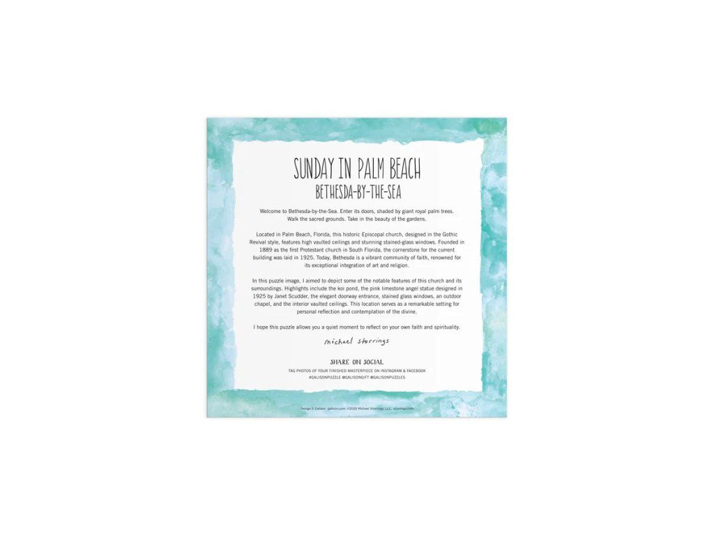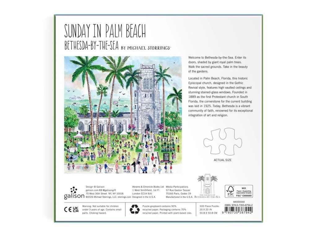 Oslávte krásu a atmosféru nedeľného rána s puzzle Nedeľa v Palm Beach od značky Galison, vytvoreného podľa ilustrácie oceneného umelca Michael Storrings. Táto detailná a očarujúca ilustrácia zachytáva radostnú energiu pokojného dňa – rozkvitnuté kvety, slávnostnú výzdobu i malebný kostol, ktoré spoločne vytvárajú harmonickú a živú scénu plnú farieb a pohody. Pri skladaní budete postupne objavovať drobné detaily a ponoríte sa do atmosféry pokoja, pohody a spoločných okamihov. Puzzle s 500 dielikmi ponúka ideálnu kombináciu relaxácie a zábavy. Dieliky sú pevné, odolné a presne do seba zapadnú. Celý produkt je navyše vyrobený zodpovedne: z 90% recyklovaného materiálu (70% pri obale) s certifikáciou FSC® a za použitia netoxických farieb. Hlavné vlastnosti: 500 dielikov puzzleilustrácie od umelca Michael Storringsmotív nedeľného rána v Palm Beachdetailná scéna s kvetinami, výzdobou a architektúrousvieže farby a pozitívna atmosférakvalitná tlač a precízne vyrezané dielikyideálny pre relaxáciu aj pohodové skladanie Značka a certifikát FSC® (Forest Stewardship Council) zaručuje, že drevo, z ktorého bol výrobok vyrobený, nebolo vyťažené nelegálne a pochádza z lesov obhospodarovaných šetrným či prírode blízkym spôsobom, v ktorom sú dodržiavané prísne environmentálne a sociálne požiadavky. Značka FSC® na výrobku znamená, že svojim nákupom pomáhate chrániť lesy a podporujete šetrné, zodpovedné či prírode blízke hospodárenie, vďaka ktorému sú naše lesy stabilnejšie, zdravšie, majú prirodzenú druhovú skladbu a lepšie odolávajú negatívnym následkom klimatických zmien.Dodatočné parametre