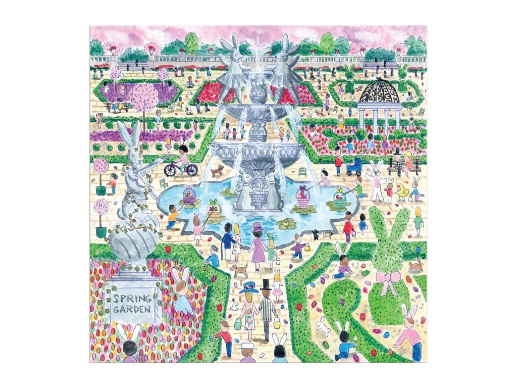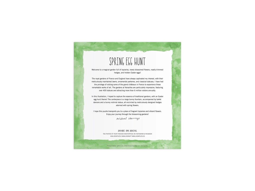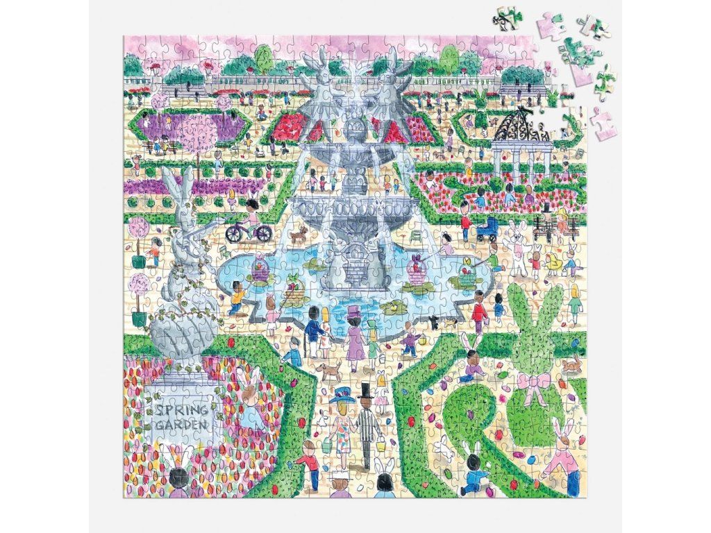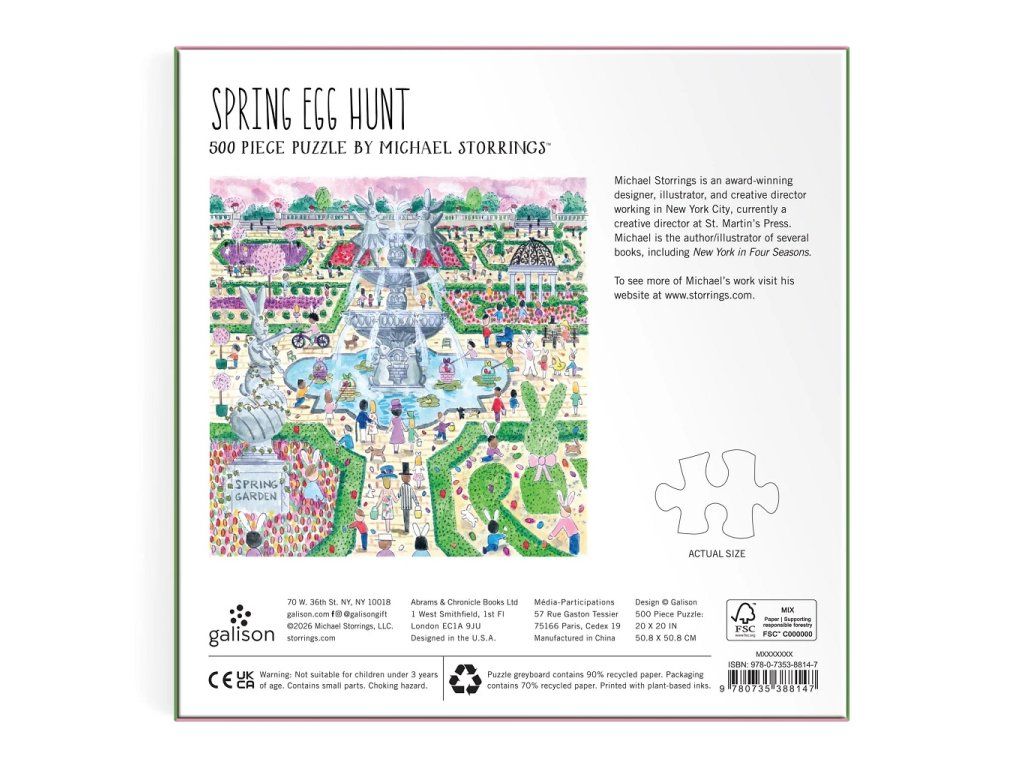 Ponorte sa do kúzelnej jarnej atmosféry s puzzle od ilustrátora Michael Storrings, vytvoreného pre značku Galison. Táto detailná ilustrácia zachytáva elegantnú záhradu inšpirovanú európskymi parkami, kde prebieha veselé veľkonočné hľadanie vajíčok. Scéna je plná rozkvitnutých kvetov, starostlivo tvarovaných kríkov, dekoratívnych sôch a hravých detailov, medzi ktorými sa ukrývajú veľkonočné vajíčka. Dominantou celej kompozície je fontána s motívom zajačika, ktorá dodáva ilustrácii rozprávkový nádych. Puzzle s 500 dielikmi ponúka príjemnú kombináciu zábavy a relaxácie a poteší všetkých milovníkov jari, detailných ilustrácií aj tematických puzzle. Vďaka použitiu netoxických atramentov a materiálov s vysokým podielom recyklovaného papiera je toto puzzle aj voľbou, ktorá rešpektuje našu planétu. Puzzle je perfektným darčekom pre seba alebo pre vašich blízkych, aby spoločne prežili radosť zo spoločne stráveného času. Užite si kúzlo Veľkej noci a jari každý deň, kedykoľvek sa na svoje dokončené puzzle pozriete. Michael Storrings je ocenený dizajnér, ilustrátor a kreatívny riaditeľ. Hlavné vlastnosti: 500 dielikov puzzleilustrácie od umelca Michael Storringsmotív jarnej záhrady a veľkonočného hľadania vajíčokbohaté detaily a pestré farbyelegantná kompozícia inšpirovaná klasickými európskymi záhradamikvalitná tlač a precízne vyrezané dielikyideálny pre relaxáciu aj rodinné skladanie Značka a certifikát FSC® (Forest Stewardship Council) zaručuje, že drevo, z ktorého bol výrobok vyrobený, nebolo vyťažené nelegálne a pochádza z lesov obhospodarovaných šetrným či prírode blízkym spôsobom, v ktorom sú dodržiavané prísne environmentálne a sociálne požiadavky. Značka FSC® na výrobku znamená, že svojim nákupom pomáhate chrániť lesy a podporujete šetrné, zodpovedné či prírode blízke hospodárenie, vďaka ktorému sú naše lesy stabilnejšie, zdravšie, majú prirodzenú druhovú skladbu a lepšie odolávajú negatívnym následkom klimatických zmien.Dodatočné parametre