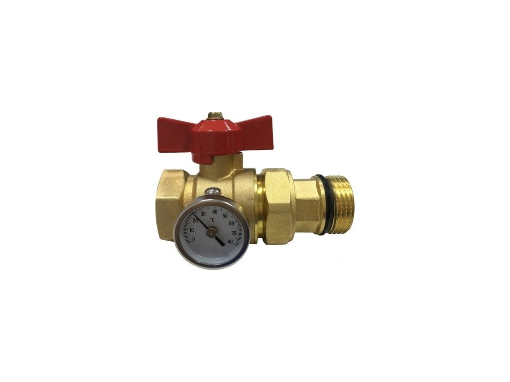 Guľový ventil priamy mosadzný pre rozdeľovač so šróbením 1" + teplomer 0°C - 80°C, ČERVENÝ motýľ