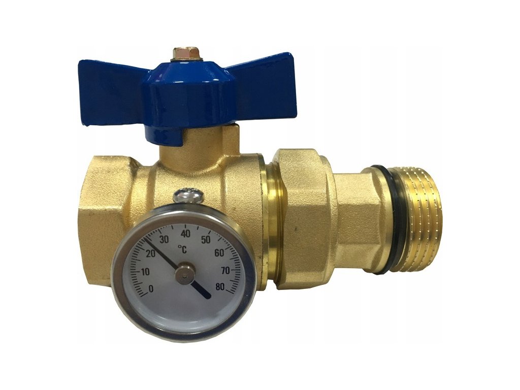 Guľový ventil priamy mosadzný pre rozdeľovač so šróbením 1" + teplomer 0°C - 80°C, MODRÝ motýľ