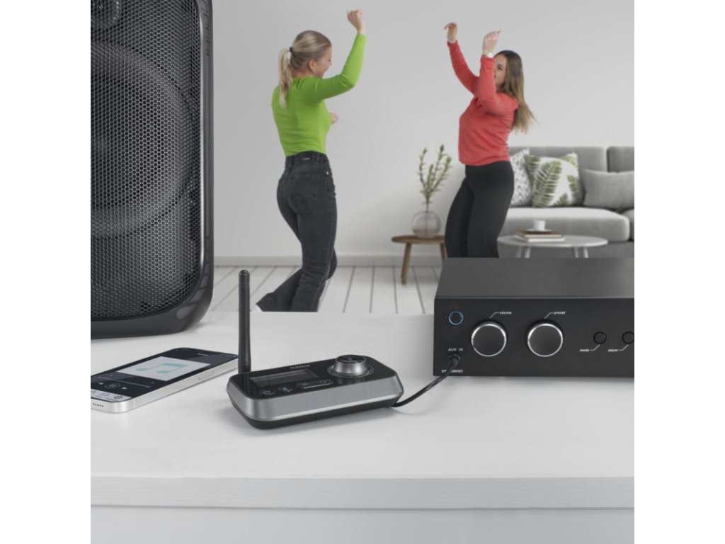 Prehľadný LCD displej vás vždy informuje o aktuálnom režime a pripojených zariadeniach. Pomocou elegantného otočného ovládača a tlačidiel môžete jednoducho ovládať prehrávanie, prijímať hovory alebo párovať nové zariadenia. Flexibilita je zaručená vďaka analógovým (jack 3,5 mm) aj digitálnym (optický Toslink) vstupom a výstupom.