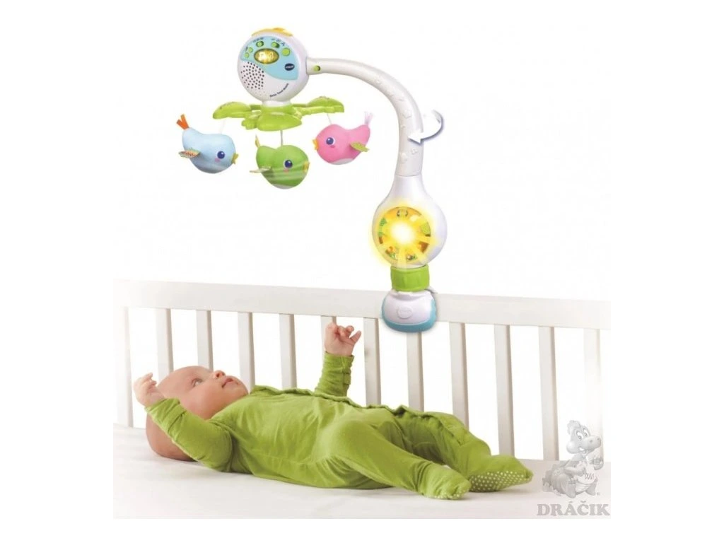 Vtech Spievajúci kolotoč v českom alebo slovenskom jazyku a s roztomilými vtáčikmi ľahko a rýchlo pripevníte na postieľku, kočík aj autosedačku. Otáča sa, hrá, spieva krásne české alebo slovenské pesničky aj popraje dobrú noc. Príjemné svetielko (možno vypnú) dodáva bábätku pocit bezpečia. Zabudovaná funkcia „aktivácia hlasom“ pomôže upokojiť bábätko aj v prípade, že sa nečakane prebudí. Točiace sa vtáčiky bábätko upokojujú a rozvíja zrakové vnímanie bábätka. Časovač umožňuje nastaviť dobu otáčania a hrania kolotoča. Súčasťou je aj rýchloupínač na postieľku a kočík a tiež kolík na pripevnenie na rukoväť sedačky.
