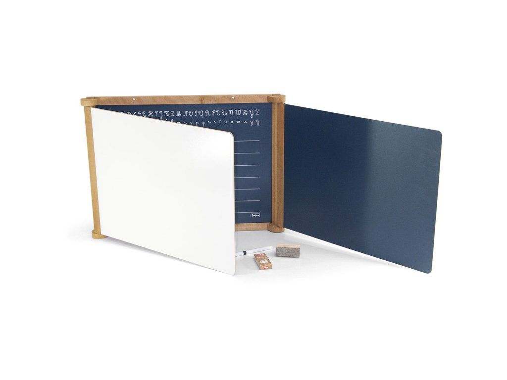 Nástenná otváracia, trojkrídlová tabuľa vybavená malým odkladacím priestorom. Na čiernu tabuľu sa píše a kreslí kriedou, bielu tabuľu možno popisovať zvlášť určenými fixky a mazať plstenou hubkou. Centrálny diel čierne tabule je linajkovaný a obsahuje vzory písacích písmen pre ľahké učenie. Vyrobené vo Francúzsku, z masívneho bukového a borovicového dreva francúzskeho pôvodu. Súčasti sú ošetrené výhradne za použitia farieb a lakov na báze vody. Balené v kartónu potlačenom rastlinnými atramenty. Súčasťou balenia sú kriedy, fix a hubka. Hlavné vlastnosti:tabuľa, 3 kriedy, fix a hubkarozmery zatvorené/otvorené tabule 56x43/156x43 cmpre kriedy, fixky, magnetickálinkovanie, vzory písmaodkladací priestorvyrobené vo FrancúzskuDodatočné parametre