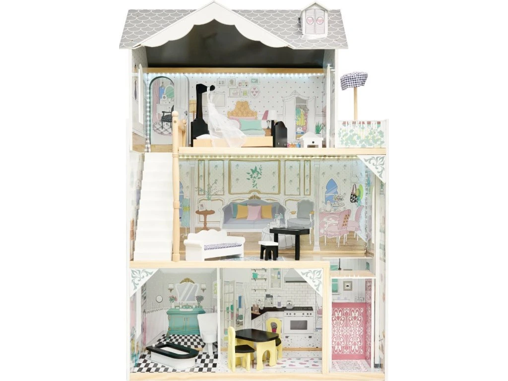 Vítejte v pohádkovém svítícím domečku se třemi patry , kde najdou oddech všechny panenky, plyšáci a figurky vašich dětí. Hra s domečkem podněcuje fantazii a podporuje správný rozvoj manuálních dovedností. Hraním různých rolí navíc dítě získá cenné sociální dovednosti. Moderní vzhled. Tři patra se čtyřmi prostornými pokoji - kuchyň, koupelna, obývací pokoj, ložnice. Balkon a výtah. Z patra do patra vede schodiště. Vybaven miniaturním nábytkem ze dřeva . Osvětlen pomocí LED pásků . Dřevěné části byly vyrobeny tak, aby se dětem při hře nedostaly do rukou třísky. Domeček zaručí nejen zábavu, ale bude i skvělou dekorací do dětského pokoje. Obsah balení: části pro sestavení domku, kovové šrouby, páska s LED světly, nábytek (stůl, 2 židle, vana, toaleta, postel s nebesy, matrace, polštář, klavír, pohovka, lampa, noční stolek, deštník) Napájení: 3 ks AA baterie (nejsou součástí balení) Rozměry domku: 82 x 33 x 122 cm.Dodatočné parametre