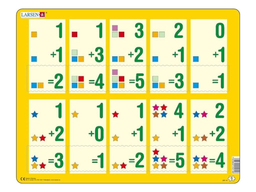 Výukové puzzle pro děti s početními příklady na procvičování sčítání, ke kterému stačí prsty jedné ruky. Je vhodné i pro mladší děti, které nerozpoznají číslice, jelikož je u každého čísla znázorněn příslušný počet čtverečků nebo hvězdiček, které lze spočítat. Dítě má za úkol doplnit výsledek, přičemž dílky lze umístit pouze v případě, že je úloha vyřešena správně. Puzzle LARSEN má pevný okraj, aby bylo pro děti skládání jednodušší, a zespodu jsou otvory pro snadné vyjmutí dílků. Díky deskovému provedení se puzzle LARSEN dobře skladuje. Obrázky jsou graficky velmi poutavé, každý dílek je rozdílný a originální, čímž vybízí děti skládat jednotlivé motivy znovu a znovu. Norský výrobce LARSEN s dlouholetou tradicí (první puzzle uvedl již v r.1953) se specializuje především na výrobu dětských vzdělávacích deskových puzzle. S tímto úzkým zaměřením se stal špičkou ve svém oboru, výrobky vyrábí až v 18 různých jazycích včetně češtiny. LARSEN má ve své nabídce více než 300 deskových puzzle a vyváží do více než 30 zemí světa. Rozměr složeného puzzle cca 36,5 x 28,5 cmDodatočné parametre