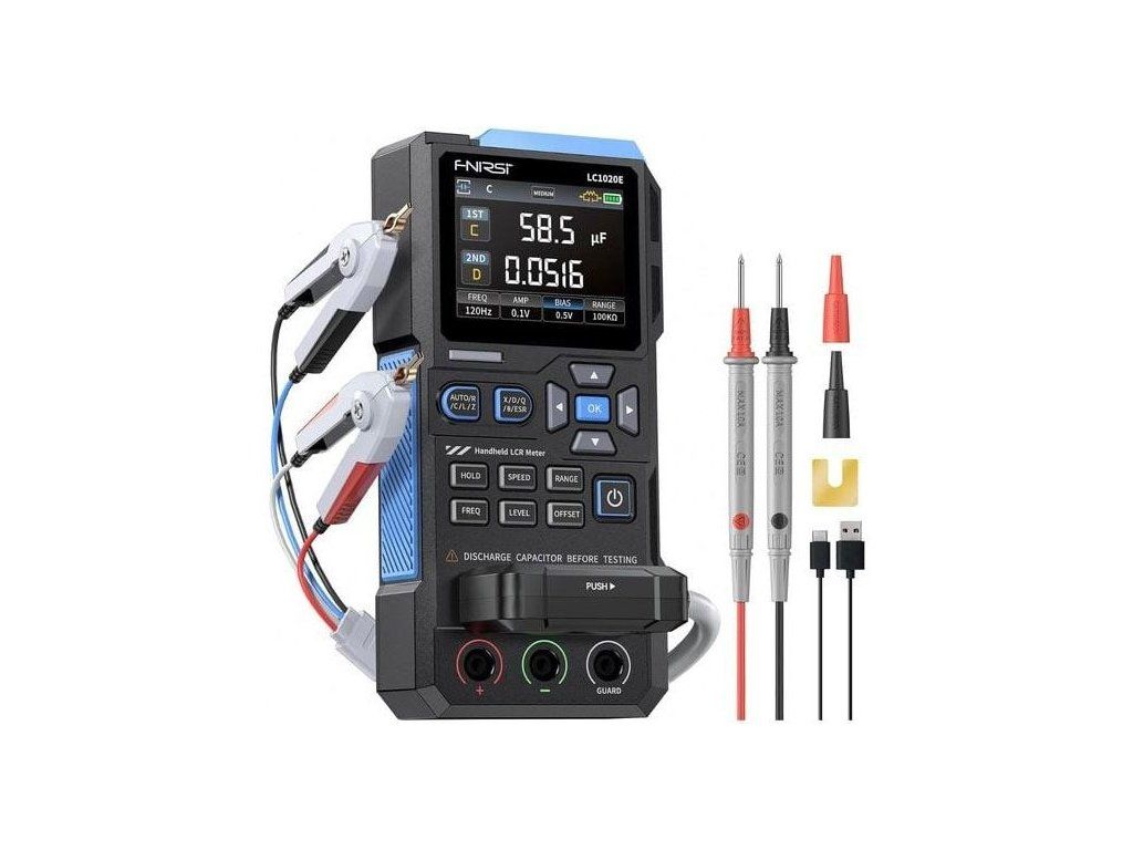 FNIRSI LC1020E je vysoko presný prenosný digitálny LCR merač určený na podrobné testovanie elektronických komponentov, ako sú induktory, kondenzátory a rezistory.