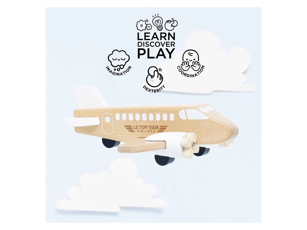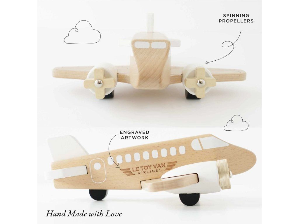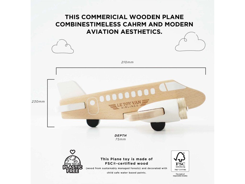 Toto drevené lietadlo spája nadčasový dizajn s modernou leteckou estetikou. Či už je používané ako dekoratívny prvok, alebo ako hračka, okamžite púta pozornosť každého dieťaťa. Je vyrobené z FSC® certifikovaného dreva, ktoré si zachováva svoju prirodzenú kresbu a krásu. Dekorované netoxickými farbami na báze vody, ktoré sú bezpečné pre deti. Prírodné drevo s bielymi akcentmi, poskytuje estetické potešenie pri preskúmavaní. Lietadlo je vybavené otočnými vrtuľami, ktoré pridávajú dojem autentickosti a podnecujú fantáziu. Pomáha rozvíjať kognitívne zručnosti, zručnosť a koordináciu ruka - oko. Hračky s účelomVšetky hračky firmy Le Toy Van sú vyrobené s cieľom - aby dlho vydržali. Dizajnované s láskou skúsenými remeselníkmi za použití etických praktík a udržateľných materiálov, ktoré sú láskavejšie k našej planéte. Hlavné vlastnosti: rozvíja zručnosť, koordináciu a predstavivosťvyrobené z dreva s certifikátom FSC®maľované netoxickými farbami na báze vodytestované podľa najprísnejších štandardovhračka bez plastov Značka a certifikát FSC® (Forest Stewardship Council) zaručuje, že drevo, z ktorého bol výrobok vyrobený, nebolo vyťažené nelegálne a pochádza z lesov obhospodarovaných šetrným či prírode blízkym spôsobom, v ktorom sú dodržiavané prísne environmentálne a sociálne požiadavky. Značka FSC® na výrobku znamená, že svojim nákupom pomáhate chrániť lesy a podporujete šetrné, zodpovedné či prírode blízke hospodárenie, vďaka ktorému sú naše lesy stabilnejšie, zdravšie, majú prirodzenú druhovú skladbu a lepšie odolávajú negatívnym následkom klimatických zmien.Dodatočné parametre