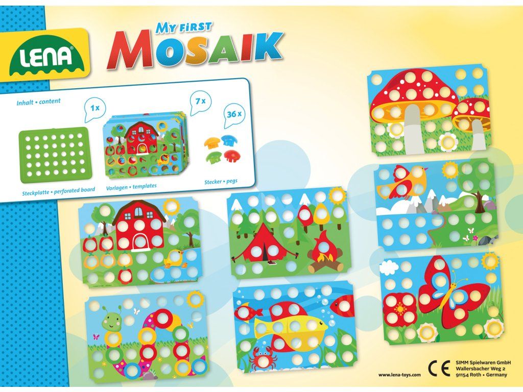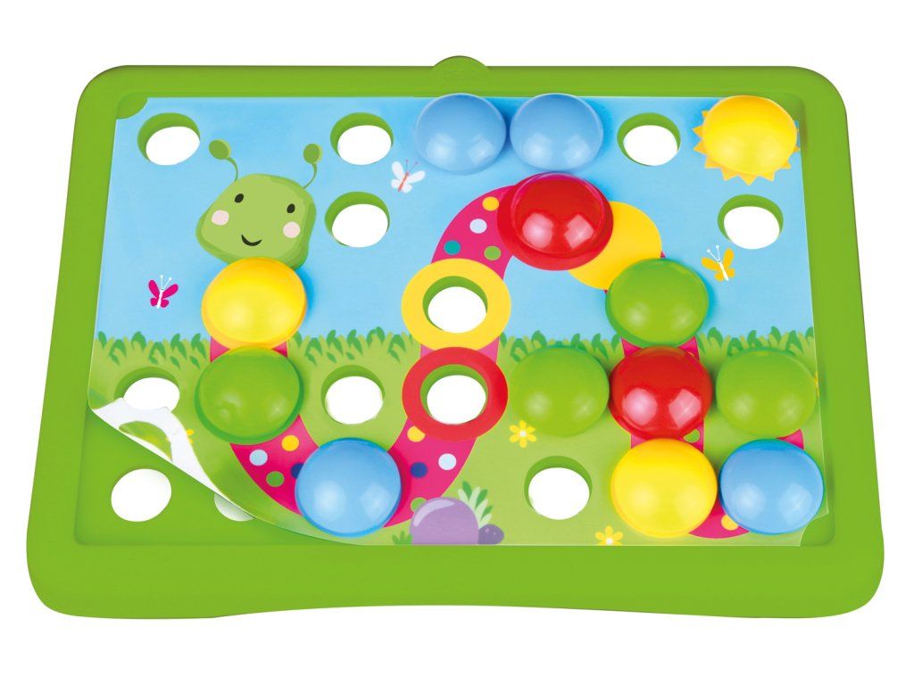 Mozaika určená najmenším deťom. Vďaka veľkým dieram a kolíčkom, nebudú mať malé ruky detí problém s umiestňovaním. Hlavné vlastnosti: súčasťou balenia je 7x farebná šablóna (slúži ako predloha na umiestňovanie štipcov)36 ks kolíčkovveľkosť kolíčka 3,3 cm priemer hlavy 2 cmDodatočné parametre