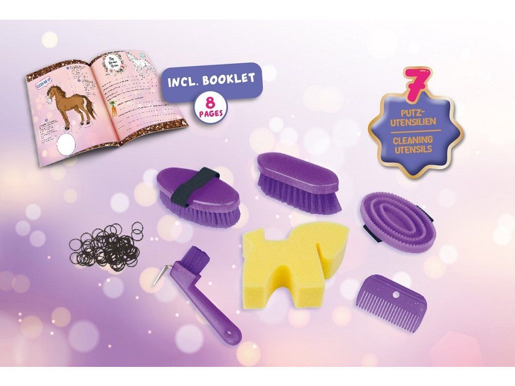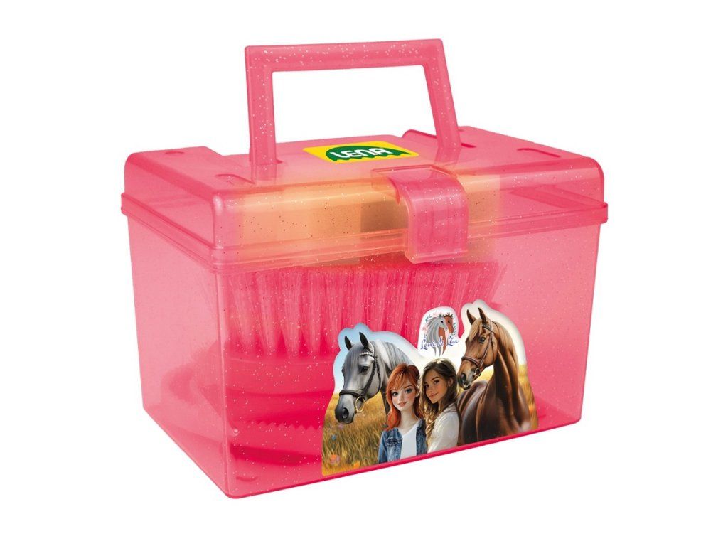 Praktická sada na čistenie koní poteší všetkých malých milovníkov koní a každodennej starostlivosti o nich. Deti si môžu vlastnoručne vyhrebeľcovať svojho poníka alebo koňa, o ktorého sa následne môžu starať s profesionálnym vybavením. Sada obsahuje všetko potrebné pre základnú údržbu – škrabka na kopytá, huba v tvare koňa, hrebeň na hrivu, hrebeň na srsť a dve rôzne kefy. Stačí sa pustiť do práce a vďaka ergonomickým tvarom prispôsobeným detskej ruke si užiť spoločné chvíle v stajni. Výsledkom je krásne čistý a spokojný kôň pripravený na vychádzku. Skvelá sada pre deti, ktoré chcú mať vlastnú výbavu a zažiť radosť zo skutočnej starostlivosti o zvieratá. Hlavné vlastnosti: kompletná sada pre základnú starostlivosť o konesada obsahuje - škrabku, špongiu, 2x hrebeň a dve rôzne kefypraktický box s uchomideálna veľkosť pre detské rukypodporuje zodpovednosť a vzťah k zvieratámjednoduchá údržba vďaka odolnému plastuideálny ako darček pre malých jazdcov a jazdkynevhodné pre deti od 3 rokovDodatočné parametre