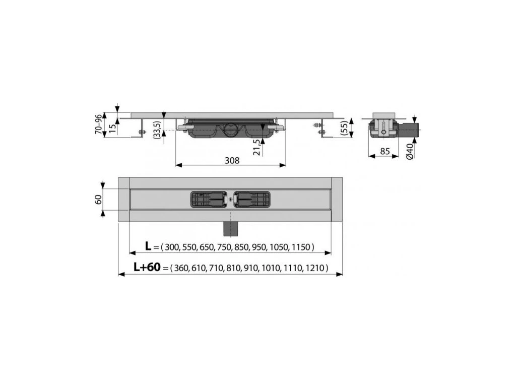 <p><strong>Dĺžka: 650mm.</strong></p> <p><strong>Použitie:</strong><br />Na použitie vo vnútri budov<br />Pre odvodnenie spŕch v úrovni podlahy<br />Pre osadenie do priestoru alebo do blízkosti stien<br />Pre perforované nerez rošty<br />Pre bezbariérový prístup<br />Pre miesta s obmedzenou stavebnou výškou podlahy<br /><br /><strong>Vlastnosti:</strong><br />Podlahový žľab z nerezovej ocele (zušľachtenie materiálu morením a pasiváciou, elektrochemické preleštenie)<br />Stavebná výška od 55 mm<br />Výškovo nastaviteľný<br />Sifón napevno spojený so žľabom - 100% vodotesnosť<br />Samolepiaca páska pre kvalitnú hydroizoláciu<br />Mechanicky čistiteľný sifón až po odpadovú trubku<br />Límec a vpust sú chránené fóliou, vanička polystyrénovou vložkou<br />Vysoký prietok je umožnený vďaka dvom komorám sifónu<br />Záruka 25 rokov<br />Materiál žľabu: nerezová oceľ AISI 304, DIN 1.4301, ČSN 17240<br />Materiál sifónu: polypropylén<br /><br /><strong>Rozsah dodávky:</strong><br />Žľab zmontovaný so sifónom<br />Kotviaci set: vrut Ø6x50 - 2 ks, hmoždinka Ø10 - 2 ks<br />Samolepiaca hydroizolačná páska<br />Ochranná fólia goliera žľabu a vtoku do sifónu<br />Inštalačný kryt koryta<br />Fixačný materiál pre uchytenie nastaviteľných nôh: skrutka M6x12 - 2 ks<br />Rošt nie je súčasťou dodávky!</p> <p><strong>Technické parametre:</strong><br />Zápachová uzávera 28 mm<br />Prietok 32 l/min<br />Odolnosť zápachovej uzávery proti tlaku 575 Pa<br />Odpadové potrubie priemer 40 mm<br />Minimálna hrúbka betónu 55 mm<br />Celková stavebná výška 70-96 mm<br />Trieda zaťaženia K3 300 kg</p> <p><strong>Normy: EN 1253.</strong></p>Buďte prvý, kto napíše príspevok k tejto položke.