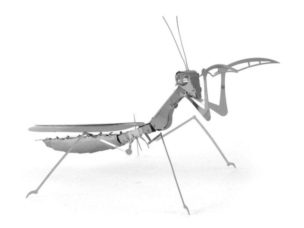 Vzrušující výzva, zážitek při skládání a oslnivý výsledek – to jsou modely METAL EARTH! Stavba 3D puzzle METAL EARTH vyžaduje trpělivost a šikovné ruce. Výsledek práce však plně vyváží vynaložené úsilí! Miniaturní repliky jsou obzvláště působivou a poutavou dekorací nejen doma, ale také v kanceláři či ve škole. Z čtvercových plátků oceli (11 x 11 cm) s částmi světových monumentů, slavných dopravních prostředků, hudebních nástrojů či zvířat Vám pod rukama vyrostou detailně propracované, fascinující modely. Autentický vzhled 3D puzzle METAL EARTH je dosažen díky detailnímu laserovému gravírování . Balení obsahuje 1 ocelový plátek s dílky a návod na složení. Nářadí není součástí balení. PRACOVNÍ POSTUP: Jednotlivé díly vyjměte z kovových plátků, v případě potřeby použijte malé štípací nůžky (nejsou součástí). Dílky se spojují k sobě pomocí zámků tvořených úchytem (zobáčkem) a otvorem. Zobáček ohněte pomocí malých tenkých kleští (nejsou součástí) a postupně spojte všechny zámky až vznikne velmi realistický mistrovský kousek! Doporučený věk: od 14 let. Kudlanka nábožná je jediný český zástupce řádu kudlanek. Kudlanka nábožná je zbarvena světle zeleně, na podzim hnědě. Díky tomuto zbarvení ji v přírodě může predátor i vášnivý entomolog snadno přehlédnout. Na první pohled zaujme přední pár končetin, který je uzpůsoben k uchvacování kořisti – loupeživé končetiny. Fungují jako střenka zavíracího nože, kořist je bleskovým sklapnutím přivřena mezi ozubenou holeň a chodidlo Více na Wikipedii Rozměr složeného puzzle cca 12 x 9 x 4 cmDodatočné parametre