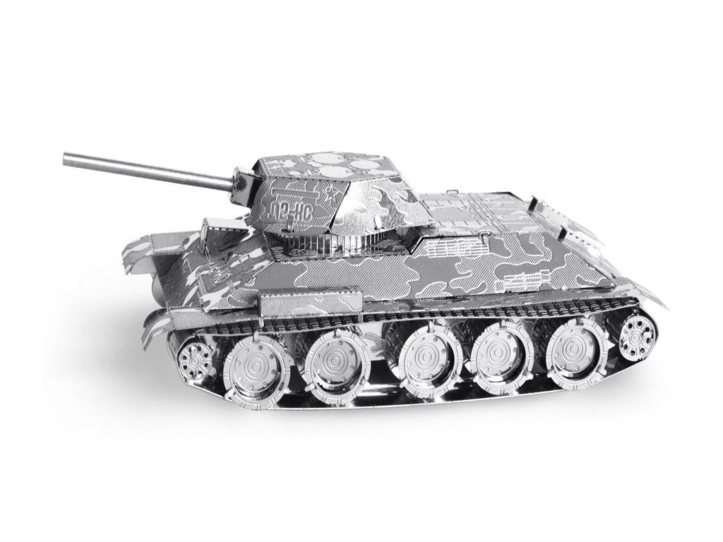 Vzrušující výzva, zážitek při skládání a oslnivý výsledek – to jsou modely METAL EARTH! Stavba 3D puzzle METAL EARTH vyžaduje trpělivost a šikovné ruce. Výsledek práce však plně vyváží vynaložené úsilí! Miniaturní repliky jsou obzvláště působivou a poutavou dekorací nejen doma, ale také v kanceláři či ve škole. Z čtvercových plátků oceli (11 x 11 cm) s částmi světových monumentů či slavných dopravních prostředků Vám pod rukama vyrostou detailně propracované, fascinující modely. Autentický vzhled 3D puzzle METAL EARTH je dosažen díky detailnímu laserovému gravírování . Balení obsahuje 2 ocelové plátky s dílky a návod na složení. Nářadí není součástí balení. PRACOVNÍ POSTUP: Jednotlivé díly vyjměte z kovových plátků, v případě potřeby použijte malé štípací nůžky (nejsou součástí). Dílky se spojují k sobě pomocí zámků tvořených úchytem (zobáčkem) a otvorem. Zobáček ohněte pomocí malých tenkých kleští (nejsou součástí) a postupně spojte všechny zámky až vznikne velmi realistický mistrovský kousek! Doporučený věk: od 14 let. T-34 byl sovětský střední tank vyvinutý na přelomu 30. a 40. let 20. století. V době svého vzniku byl bezpochyby nejlepším středním tankem na světě. V čase zahájení operace Barbarossa neexistoval německý tank, který by se mu mohl úspěšně postavit v boji – dalece všechny překonával výzbrojí i pancéřováním, většina ho dokonce nebyla schopna vůbec ohrozit. Časté tvrzení, že se jednalo o nejlepší střední tank druhé světové války, je sice sporné, avšak tvrzení, že to byl nejlepší střední tank let 1940,1941 a tank, který pomohl SSSR vyhrát Velkou vlasteneckou válku, nelze zpochybňovat. Více na Wikipedii Rozměr složeného puzzle cca 7,5 x 4 x 3 cmDodatočné parametre