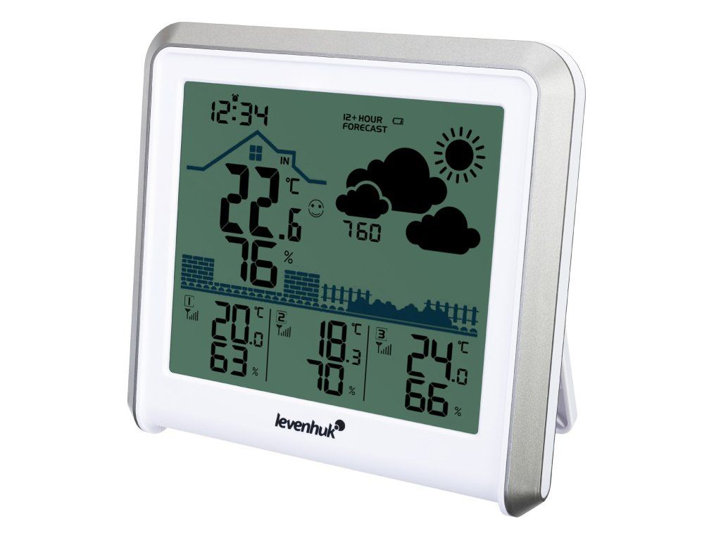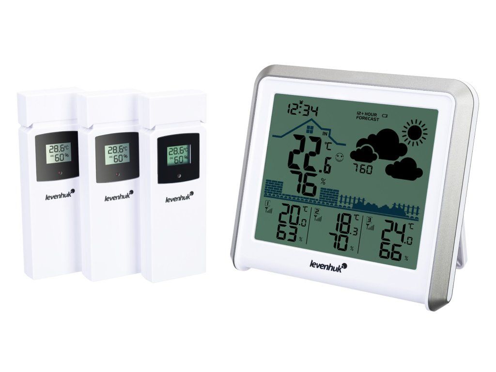 Meteostanica Levenhuk Wezzer PLUS LP50 meria nielen teplotu a vlhkosť, ale aj atmosférický tlak. Pomocou údajov vytvorí predpoveď počasia na nasledujúcich 12 hodín. Obrazovka základňovej stanice sa delí do niekoľkých blokov, ktoré zobrazujú graficky prehľadné informácie ako predpoveď počasia, presný čas a indikátor komfortu v miestnosti. Senzory majú vlastné obrazovky, preto sa dozviete potrebné údaje nielen na základňovej stanici, ale aj na nich priamo na mieste merania. Pamäť prístroja ukladá maximálne a minimálne namerané hodnoty. Pokiaľ vám funkcia stanice nestačí, oceníte možnosť použiť ju ako stolné hodiny a budík s opakovaným budením po 5 minútach.