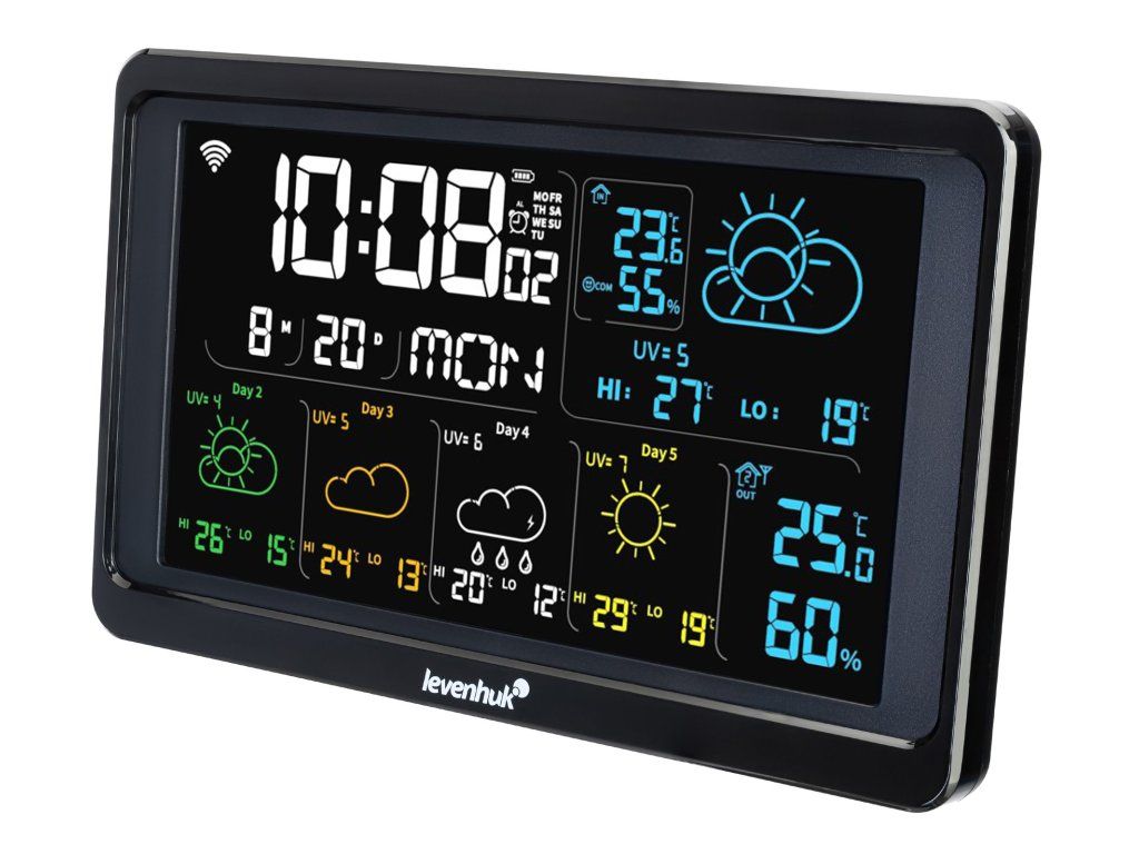 Na veľkej farebnej LCD obrazovke sa dozviete až päťdňovú predpoveď počasia. Zobrazuje sa v blokoch s ikonami pre čo možno najväčšiu prehľadnosť. Stanica zároveň ukazuje aj dátum, deň v týždni a presný čas, čím dokáže nahradiť hodiny. Zaznamenáva maximálne a minimálne hodnoty teploty. V prípade, že chcete upozorniť na prekročenie určitej teploty vonku alebo vo vnútri domu, nastavíte si alarmy. Hodnoty, pri ktorých sa upozornenie spustí, si osobne nastavíte vy sami.
