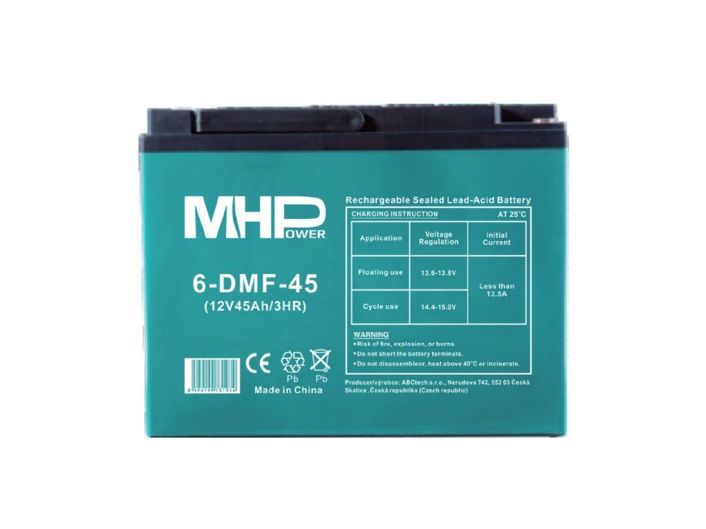 Trakční gelová baterie MHPower 6-DMF-45 je spolehlivým zdrojem energie navrženým pro náročné aplikace, které vyžadují hluboké cykly nabíjení a vybíjení. S kapacitou 45Ah a napětím 12V je ideální pro napájení elektrických vozidel, golfových vozíků, solárních systémů, nebo jako záložní zdroj energie. Díky gelové technologii je odolná vůči vibracím, nevyžaduje údržbu a má delší životnost než tradiční olověné baterie. Baterie je optimalizována pro hluboké cykly (Deep Cycle), což z ní činí ideální volbu pro aplikace s vysokou cyklickou zátěží. Tyto baterie jsou tedy nezbytné všude tam, kde je potřeba stabilního a dlouhodobého výkonu, a kde se očekává časté hluboké vybíjení. Jedná se o uzavřené olověné akumulátory v provedení VRLA. Trakční baterie MHPower jsou určeny především pro následující použití: - Elektroskútry, elektrokola, elektrokoloběžky - Zdravotnická zařízení, zdravotní lehátka, postele, křesla - Lodě, plachetnice, šluny (vnitřní elektromotory a spotřebiče) - Mobilní systémy řízení dopravy, semafory a další řízení dopravy - Solární a fotovoltaické sestavy a jejich zařízení - Běžné elektromotory, golfové vozíky, rybářské čluny - Dětská vozítka, autíčka, motorky - Karavany, zahradní domky, mobil homy, obytné vozy, přívěsy Klíčové vlastnosti trakční baterie - Vysoká spolehlivost a cyklická stálost díky zesíleným mřížkám elektrod - Bezúdržbová baterie - Odolná vůči vibracím, náklonu či úniku elektrolytu - Dostatečná kapacita vhodná pro dlouhé používání - Baterie je optimalizována pro hluboké cykly (Deep Cycle) Nabíjecí a vybíjecí proudy: 1/ Maximální nabíjecí proud: 0,1C až 0,25C (C=hodnota Ah jmenovité kapacity baterie) 2/ Doporučený vybíjecí proud pro zachování dlouhé životnosti: max. 0,3C (C=hodnota Ah jmenovité kapacity baterie) Fyzické charakteristiky Hmotnost [kg]: 12,2 Šířka [mm]: 223 Výška [mm]: 174 Výška s konektory [mm]: 174 Hloubka [mm]: 121Dodatočné parametre