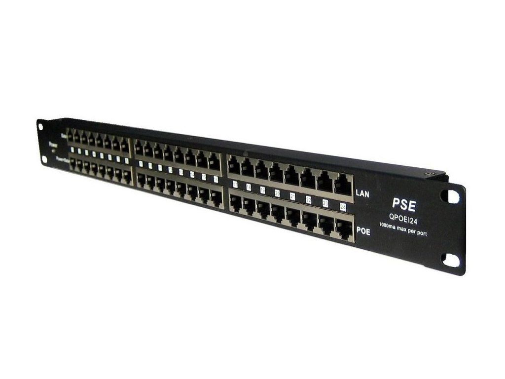 Panel integrující 24 pasivních PoE injektorů do jediného 19"/1U panelu vhodný pro napájení až 24 zařízení. Profesionální řešení pro vzdálené napájení většího počtu aktivních prvků s podporou pasivního PoE. Důležité vlastnosti - 19" provedení - 24 portů s podporou pasivního PoE - LED kontrolka pro zjištění funkčního napájecího adaptéru - Zemnící šroubek na zadní straně panelu pro odfiltrování přepětí - Vratná pojistka proti zakolísání proudu (OCP ochrana 650mA) na každém portu - Vstupní napájecí konektor - standardní jack 2.1/5.5mm Použití Do RJ45 konektorů označených jako "DATA" na jedné straně se připojují ethernetové porty bez napájení (např. switch) a na opačnou stranu "POWER + DATA" se připojují zařízení využívající napájení po ethernetovém kabelu. POE-PAN24 je kompatibilní s aktivními prvky využívající k napájení piny 4/5+ piny7/8-. Vhodné zejména pro prvky značek MikroTik a Ubiquiti. Výkon napájení optimalizovat dle použitých zařízeních a jejich konfigurace.Dodatočné parametre