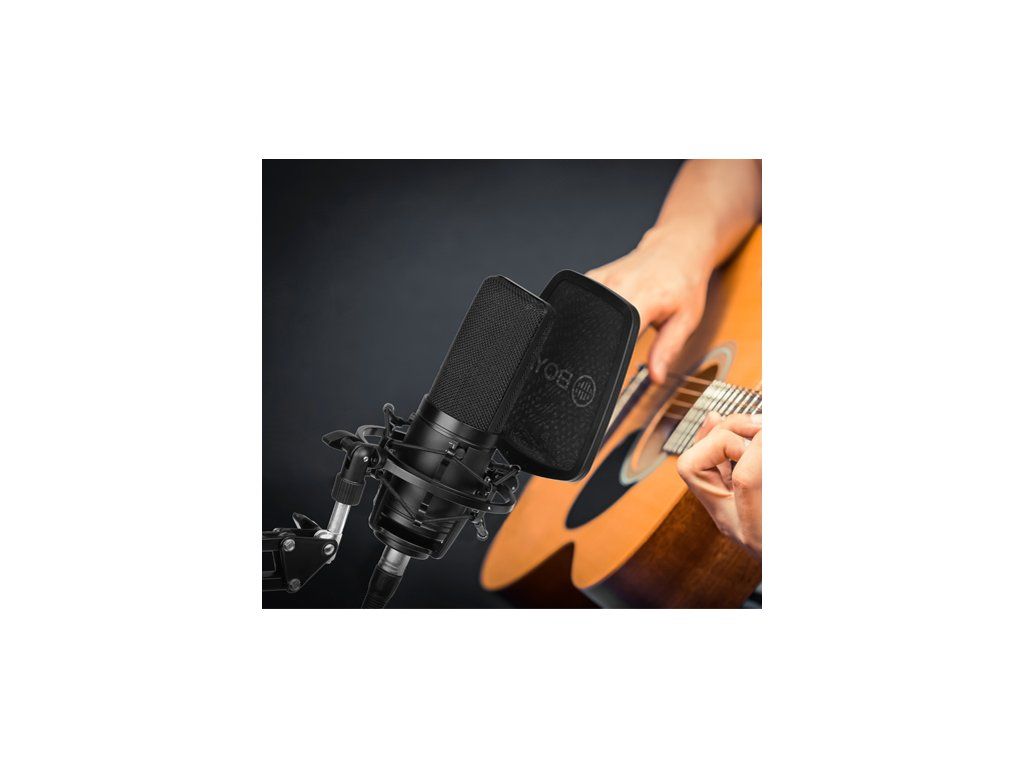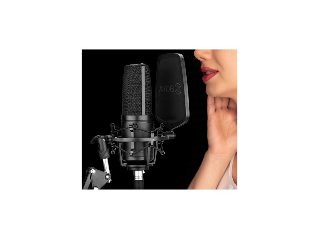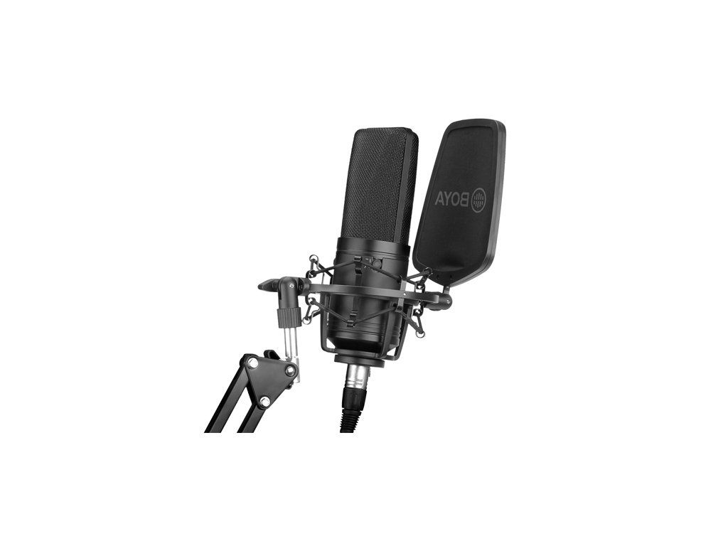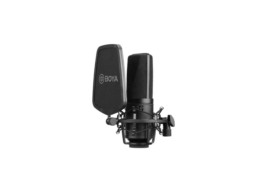 Boya BY-M1000 je kondenzátorový štúdiový mikrofón s veľkou 34mm membránou, ktorý poskytuje prirodzený a príjemný zvuk v širokom frekvenčnom pásme s rozsahom 35 Hz až 18 kHz. Je teda vhodný pre nahrávanie v štúdiových aplikáciách – ako pre harmonické, melodické a perkusívne nástroje, tak aj pre prvý hlas a vokály či rap. Mikrofón sa napája tradične 24V alebo 48V fantómovým napájaním, ktoré je dodávané z predzosilňovača, z konzoly alebo cez rozhranie. Súčasťou balenia je aj tlmič, pop shield proti perniciam (hlásky P a B) aj 3m XLR kábel pre pripojenie mikrofónu.