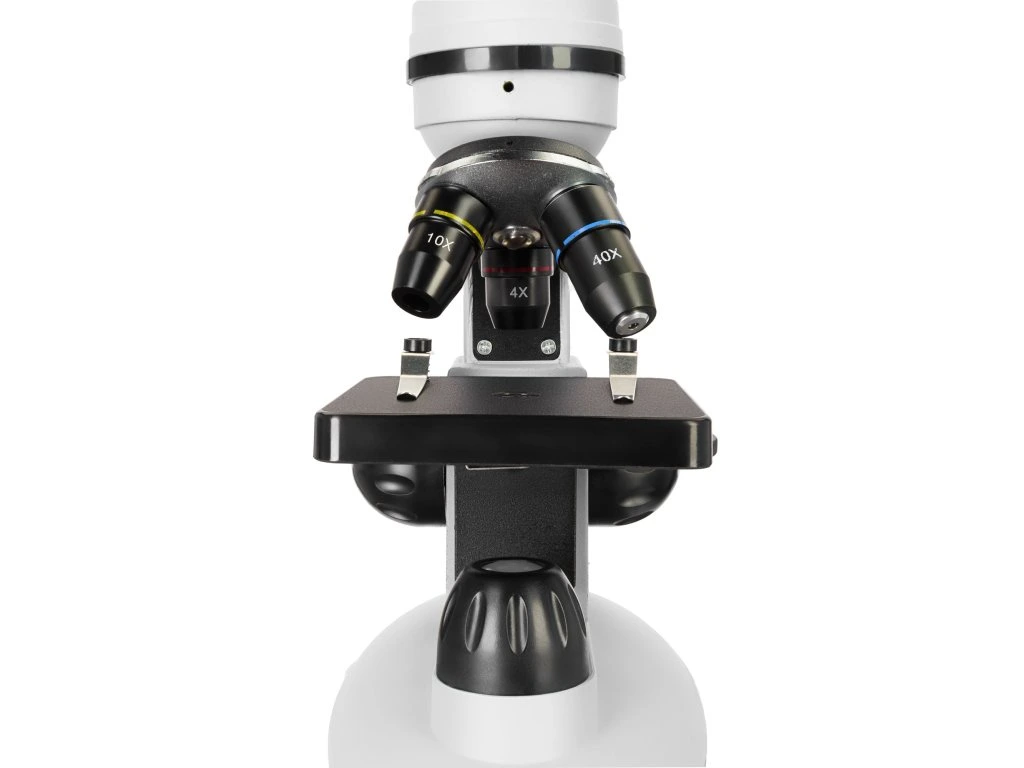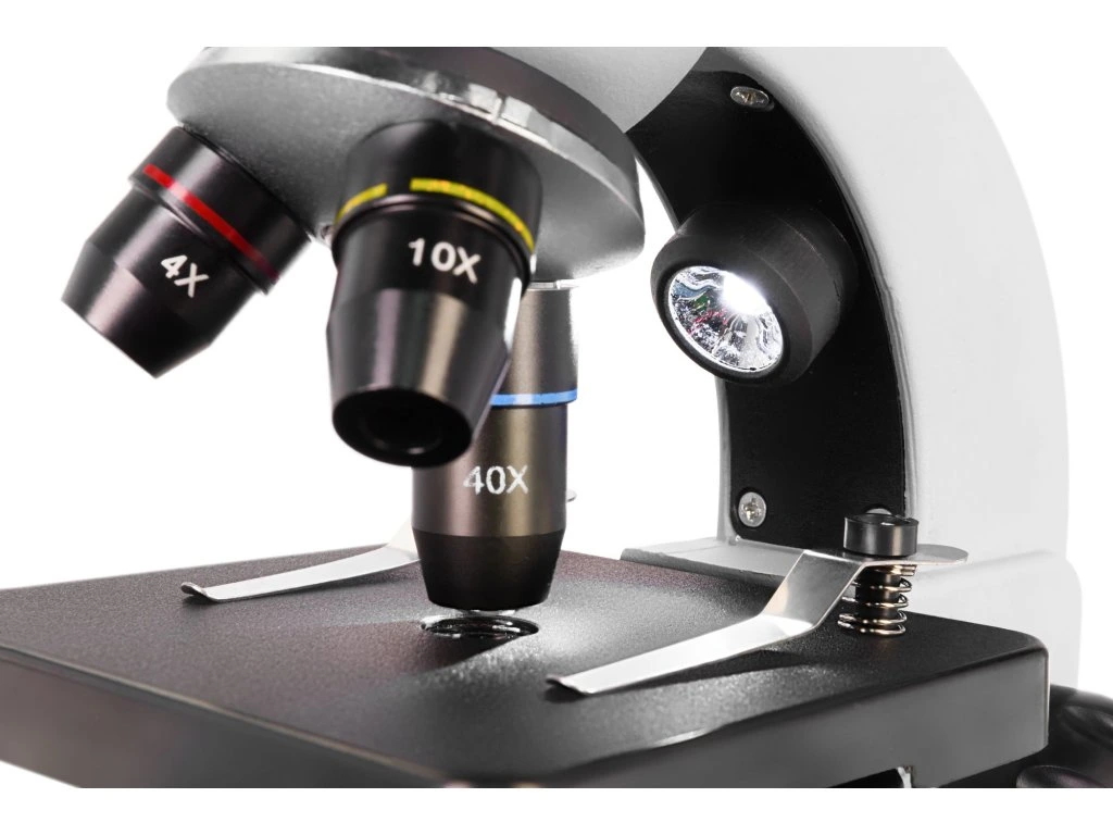 Obsahuje achromatické objektívy a širokouhlý okulár. Všetky šošovky vyrobené z optického skla poskytujú ostrý kontrastný obraz a objektív so 40x zväčšením využíva ochranný pružinový rám.