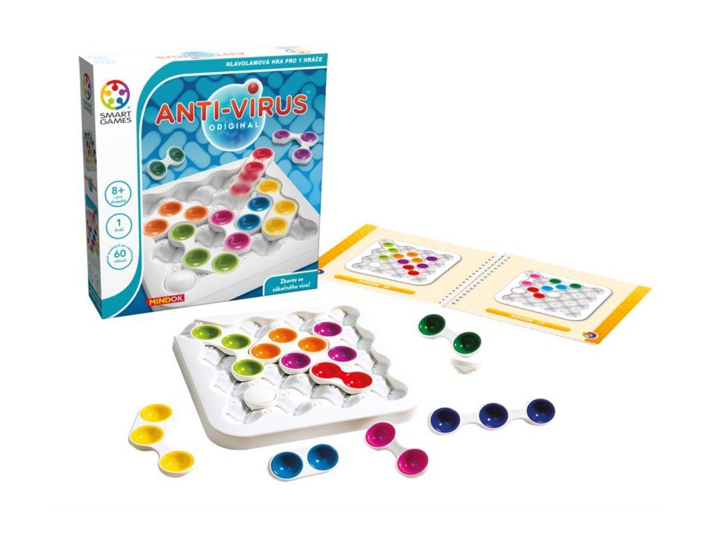 Zapojte své tělo i mysl a zbavte se zákeřného viru! Zákeřný virus napadl buňku lidského těla. Dokážete se ho zbavit dříve, než se rozmnoží a napadne další buňky? Tato hra je ještě větší výzvou, než to na první pohled vypadá. Dokážete si představit, že uvnitře buňky zrovna není mnoho místa. Virus a další molekuly se stále blokují a překážejí si v cestě. Navíc se mohou pohybovat i ve skupinách a hýbou se pouze diagonálně. Nikdo neodolá této nakažlivé zábavě. Cestovní váček vám umožní vzít si hru kamkoli s sebou. Zadání obsahuje 60 různě obtížných úloh. Hra Anti-VIRUS patří do skupiny víceúrovňových, logických her Smart games , které jsou určeny především pro jednoho hráče (nicméně hru může hrát i hráčů více). Logické hry Smart Games obsahují vždy zadání v několika různých stupních obtížnosti, rozvíjí IQ, logické myšlelní, prostorovou představivost, koncentraci a plánování. Pravidla hry: Vyberte rébus z knížky zadání a naskládejte dílky na herní desku podle zadání. Pohybujte dílky po diagonálách.Pokud se vám podaří dostat červený virus z buňky ven, vyřešili jste rébus! Hra obsahuje: herní desku, 11 herních dílků, červený virus, předlohyDodatočné parametre