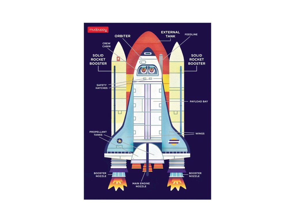 Toto mini puzzle s motívom raketoplánu poteší každého chlapca. Nielen, že si precvičia logické myslenie a motoriku, ale aj sa dozvedia, z akých častí sa raketoplán skladá. V krabičke je totiž vložený návodný obrázok, kde na jednej strane je obrázok raketoplánu a na strane druhej schéma raketoplánu s popisom jeho častí. Puzzle je vyrobené z 90% recyklovaného papiera a krabička obsahuje 70% recyklovaného papiera. Pre potlač boli použité netoxické farby na báze sóje. Všetky produkty Mudpuppy spĺňajú bezpečnostné normy CPSIA, ASTM a CE. Hlavné vlastnosti: vhodné na cestovanienávodný obrázok so zaujímavými informáciamivyrobené z prevažne recyklovaného materiálupotlačené netoxickými farbami na báze sójerozvíja sústredenie a motorikuDodatočné parametre