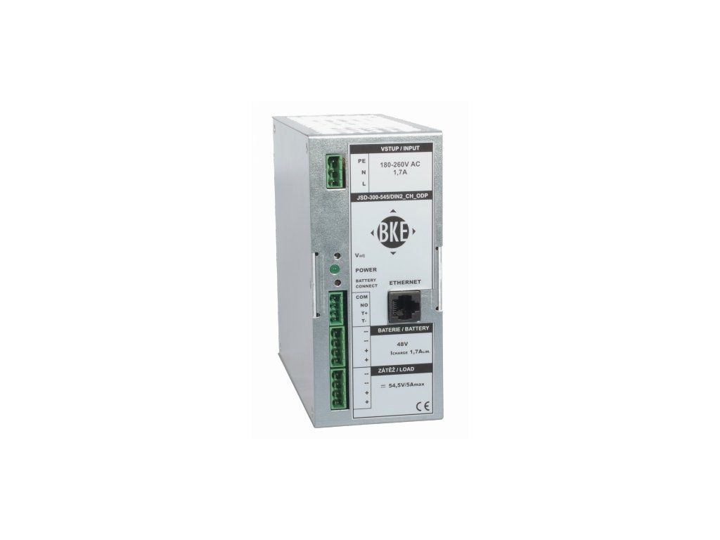 Průmyslový napájecí zdroj/nabíječ Pb akumulátorů na DIN lištu BKE JSD-300-275/DIN2_CH_ODP 27,5 V, 300 W, 10 A, spínaný s odpojovačem akumulátoru zabraňující jeho hlubokému vybití a poškození. Zdroj je vybaven dálkovým managementem pomocí SNMP nebo web rozhraní umožňující správu zdroje a zasílání alarmů při překročení nastavených parametrů. Dálkově je možní krátkodobě odpojit výstupní napětí a tím uajistit restart připojených zařáízení. Zdroj má ochranu proti zkratu a přetížení na výstupu, přepětí a podpětí na výstupu a tepelnou ochranu. Nabíječ je vybaven aktivní kompenzací účiníku (PFC). Zdroj je vhodný pro napájení informační a telekomunikační techniky s možností zálohování DC napětí. Zdroj má účinnost vyšší než 85%. Zdroj lze provozovat i bez připojeného akumulátoru.