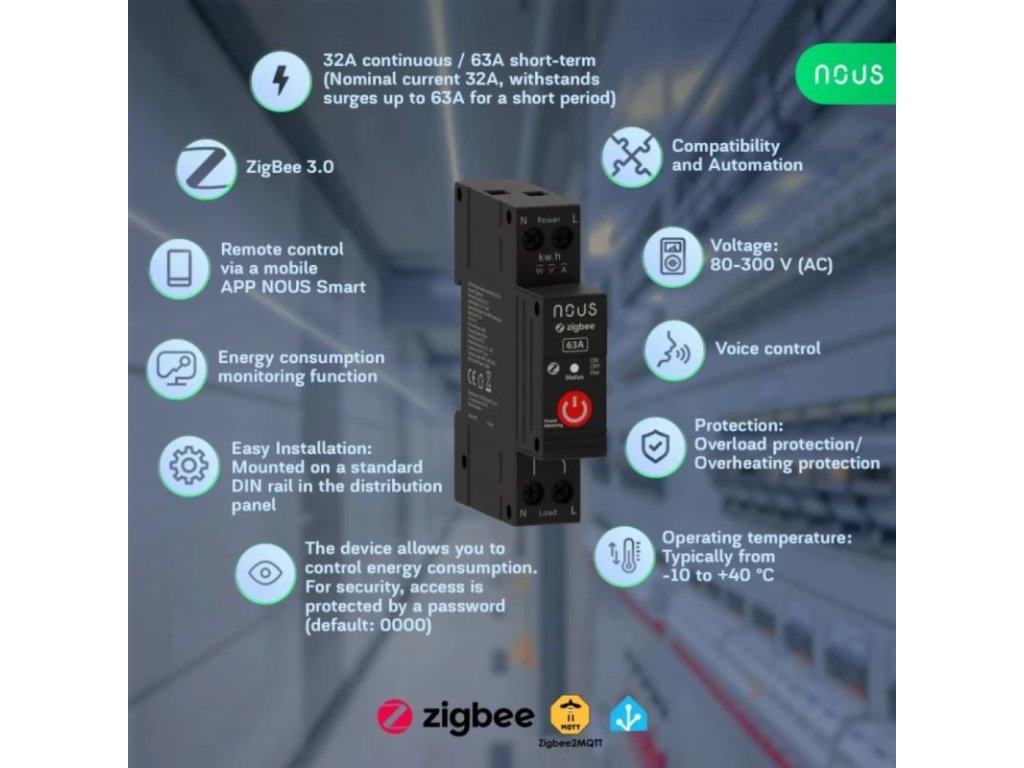 Vysoký Výkon a Spoľahlivosť: S trvalou záťažou 32 A a krátkodobými špičkami až do 63 A je Nous D5Z Pro ideálny pre ovládanie veľkých záťaží, ako sú zásuvkové vetvy, vykurovacie systémy, čerpadlá alebo osvetlenie.