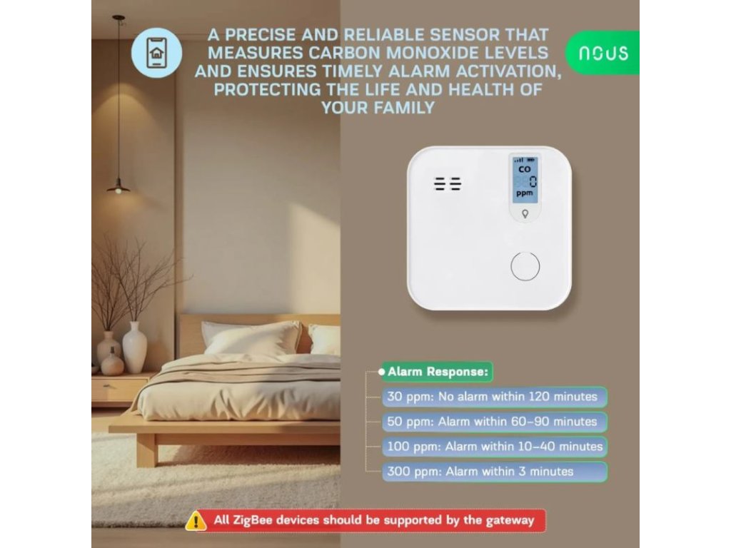 Nous E12 Zigbee detektor oxidu uhoľnatého je nevyhnutným doplnkom pre každú modernú domácnosť, ktorý vám poskytne pokoj a istotu vďaka spoľahlivej ochrane pred neviditeľným nebezpečenstvom.