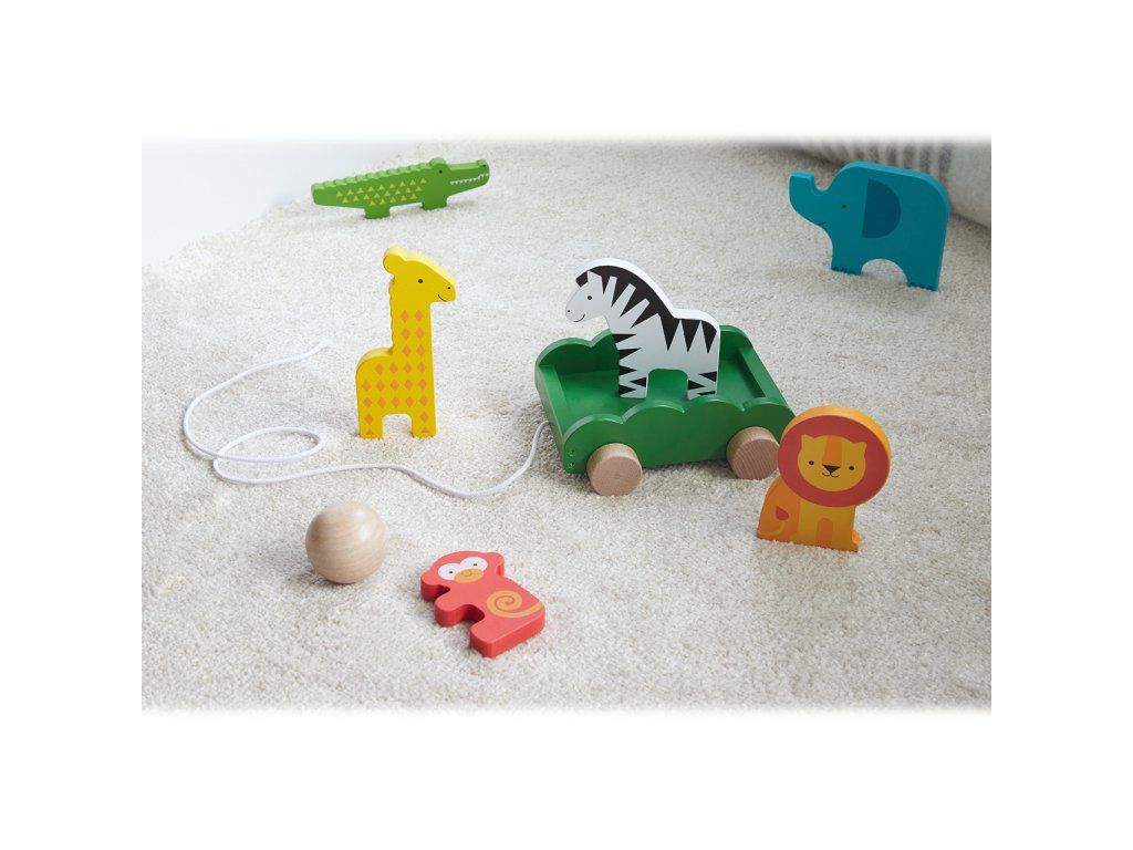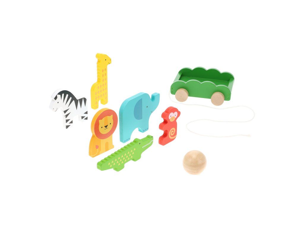 Pestrofarebné figúrky usmievavých zvieratiek vo vozíku čakajú, kým ich deti rozostavia a pokúsia sa ich zvaliť pribalenou guľou. Vďaka rozličným tvarom je zrážanie figúrok rôzne ťažké. Zvieratká je možné ľahko využiť aj pri mnohých iných fantastických hrách. Hračka pomáha rozvíjať hrubú motoriku, koordináciu pohybu a senzomotorické zručnosti. Hlavné vlastnosti:vozík, 6 figúrok a gulehra a ťahacia hračka v jednomDodatočné parametre