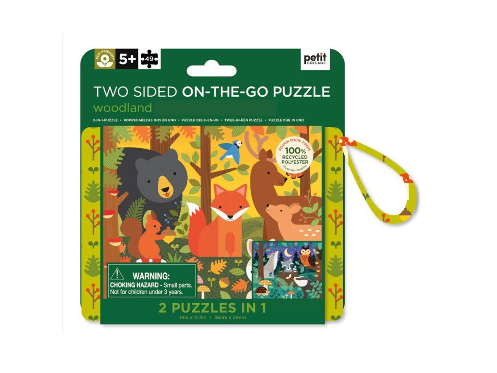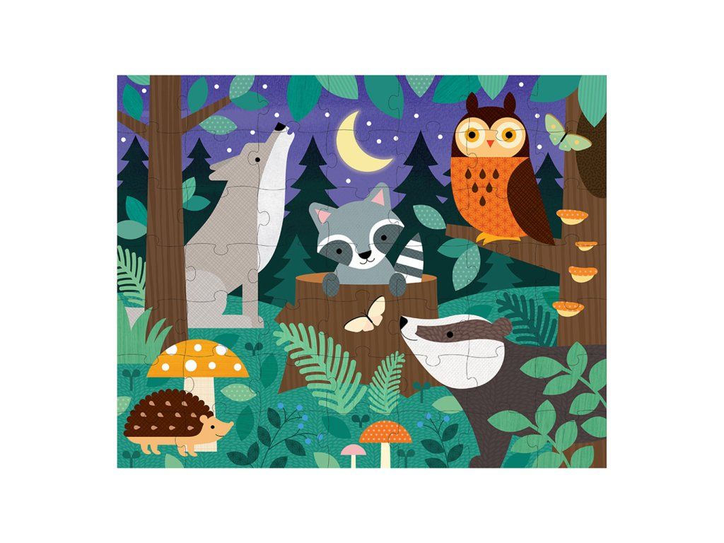 Obojstranné puzzle s roztomilou ilustráciou zvieratiek z lesa. Puzzle pre predškolské deti je zábavné aj edukatívne zároveň. Zložte si z puzzlí obrázok zvieratiek, ako sa v lese hrajú cez deň alebo otočte dieliky a pozrite, ako odpočívajú v noci. Dieliky sú vyrobené z FSC recyklovaného papiera a obal na ne zo 100% recyklovaného polyesteru. Puzzle je dodávané v praktickom vrecúšku na zips, dieliky puzzlí tak do neho možno jednoducho uložiť a tým sa stáva vhodným spoločníkom na doma aj na cesty. Hlavné vlastnosti: obojstranné puzzle 49 dielikov vyrobené z recyklovaných materiálov potlačené netoxickými rastlinnými atramentmi zodpovedá normám CPSIA, ATSM a CE vhodné od 5 rokov Značka a certifikát FSC® (Forest Stewardship Council) zaručuje, že drevo, z ktorého bol výrobok vyrobený, nebolo vyťažené nelegálne a pochádza z lesov obhospodarovaných šetrným či prírode blízkym spôsobom, v ktorom sú dodržiavané prísne environmentálne a sociálne požiadavky. Značka FSC® na výrobku znamená, že svojim nákupom pomáhate chrániť lesy a podporujete šetrné, zodpovedné či prírode blízke hospodárenie, vďaka ktorému sú naše lesy stabilnejšie, zdravšie, majú prirodzenú druhovú skladbu a lepšie odolávajú negatívnym následkom klimatických zmien.Dodatočné parametre