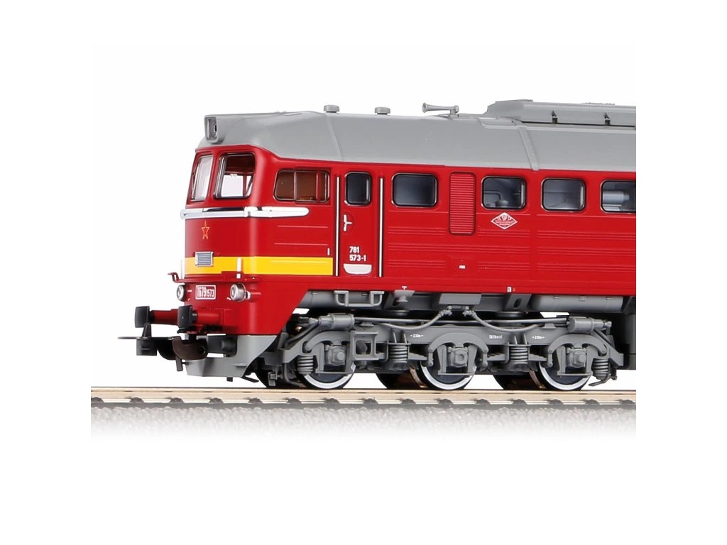 Atraktívny model šesťnápravovej dieselelektrickej lokomotívy T 679.1 „Sergej“ Československých štátnych dráh, slúžiaci najmä na ťahanie ťažkých nákladných vlakov. Typ M62 patril medzi vôbec najvýkonnejšie stroje veľmi hojne zastúpené v krajinách východného bloku. Vyrábané boli až do prelomu tisícročia a ešte aj dnes ich možno vidieť v aktívnej službe pri Maďarských štátnych železniciach. Modelu na prvý pohľad dominuje mohutný a podrobne spracovaný podvozok so starostlivo stvárnenými detailmi zavesenia a pneumatického systému bŕzd. Výlisok vysoko posadenej karosérie dôsledne zachytáva mriežky ventilácie, veka a dvierka obslužných zariadení aj jemné línie krytia. Charakteristickými postrannými okienkami možno nazerať do členitého intieriéra strojovne. Prvotriedne lakovanie dáva pútavo vyniknúť najmä mnohým chrómovaným prvkom na čelách. Značenie a prevádzkové detaily sú vďaka najkvalitnejšej potlači dokonale ostré a jasne čitateľné. Úprava strechy verne odráža skutočné stroje, a neskoršie série sú tak ľahko rozoznateľné podľa prítomnosti skrine tlmiča výfuku. Na účely vystavenia vo vitríne je možné model doplniť detailmi tiahlového ústrojenstva, ktoré sú súčasťou balenia. Pohon zaisťuje výkonný motor s rozmernými zotrvačníkmi a moment je prenášaný prostredníctvom dvojice uhlopriečne usporiadaných bandážovaných kolies na vnútorných nápravách, poháňaná je však hneď štvorica dvojkolesí. Mohutný a precízne zhotovený podvozok potom významným dielom prispieva k mimoriadnym jazdným vlastnostiam modelu a pomáha autenticky sprostredkovať parametre charakteristickej predlohe. Trojica svetiel na čelách sa rozsvecuje a mení farbu v závislosti od smeru jazdy. Osvetlením je ďalej vybavená ako kabína rušňovodiča, tak aj strojovňa. Individuálne riadenie všetkých svetiel je potom možné dosiahnuť vstavaním digitálneho ovládania. Model je možné rozšíriť zvlášť určeným digitálnym dekodérom so zvukovým modulom a reproduktorom. Hlavné vlastnosti:šestica nápravmotor s dvojicou zotrvačníkovdvojica bandážovaných hnacích koliessvetlá s prepínaním farby podľa smeru jazdyosvetlenie interiérurozhranie PluX22 podľa NEM 658šachta podľa NEM 362 s kinematikou krátkeho spriahadla Dokumentácia:všeobecné informácie k T 679.1 (M62) (CZ)všeobecné informácie k príbuzným modelom V 200 (M62) (DE, EN, FR, PL)návod na obsluhu a zoznam náhradných dielov modelu č. 52814 (DE, EN, FR, NL)Dodatočné parametre