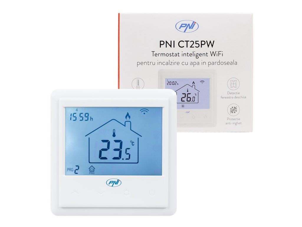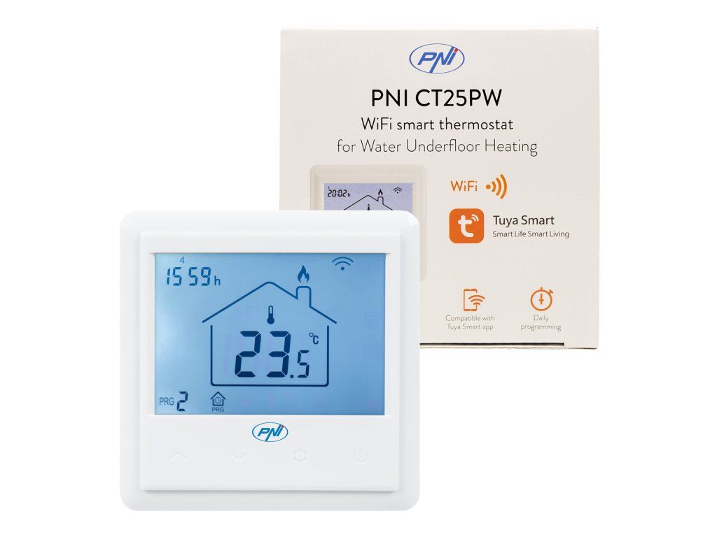 PNI CT25PW WiFi vstavaný inteligentný termostat, ovládanie cez internet, podlahové kúrenie, pohony, čerpadlá, bojler, mobilná aplikácia Tuya Smart, integrácia do smart scenárov s ďalšími kompatibilným