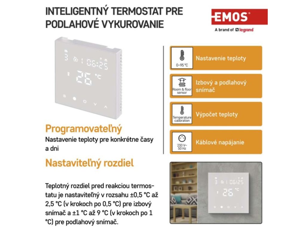 | nastaviteľný rozptyl teploty: | vnútorné čidlo: 0,5 °C až 2,5 °C, rozlíšenie 0,5 °C; podlahové čidlo: 1 °C až 9 °C, rozlíšenie 1 °C |