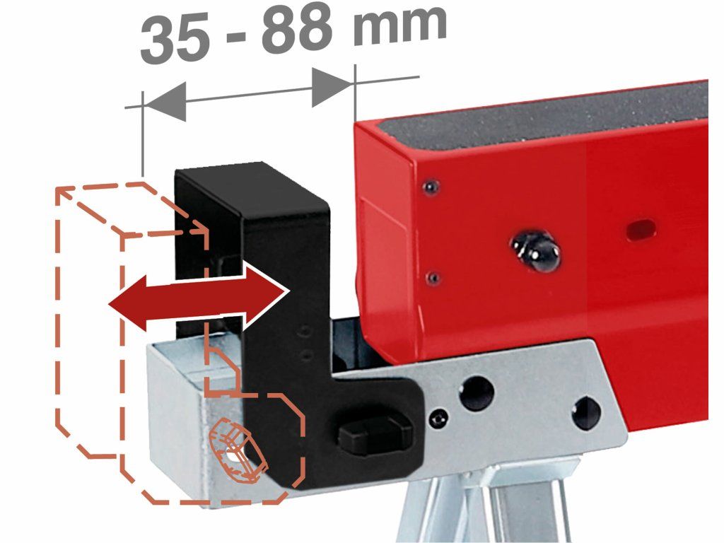 - na každom konci je úchyt s možnosťou nastavenia šírky v rozmedzí 35-88mm, ktorý slúži na uchytenie drevených lát pre vytvorenie širšej pracovnej plochy alebo fixáciu materiálu pri opracovaní