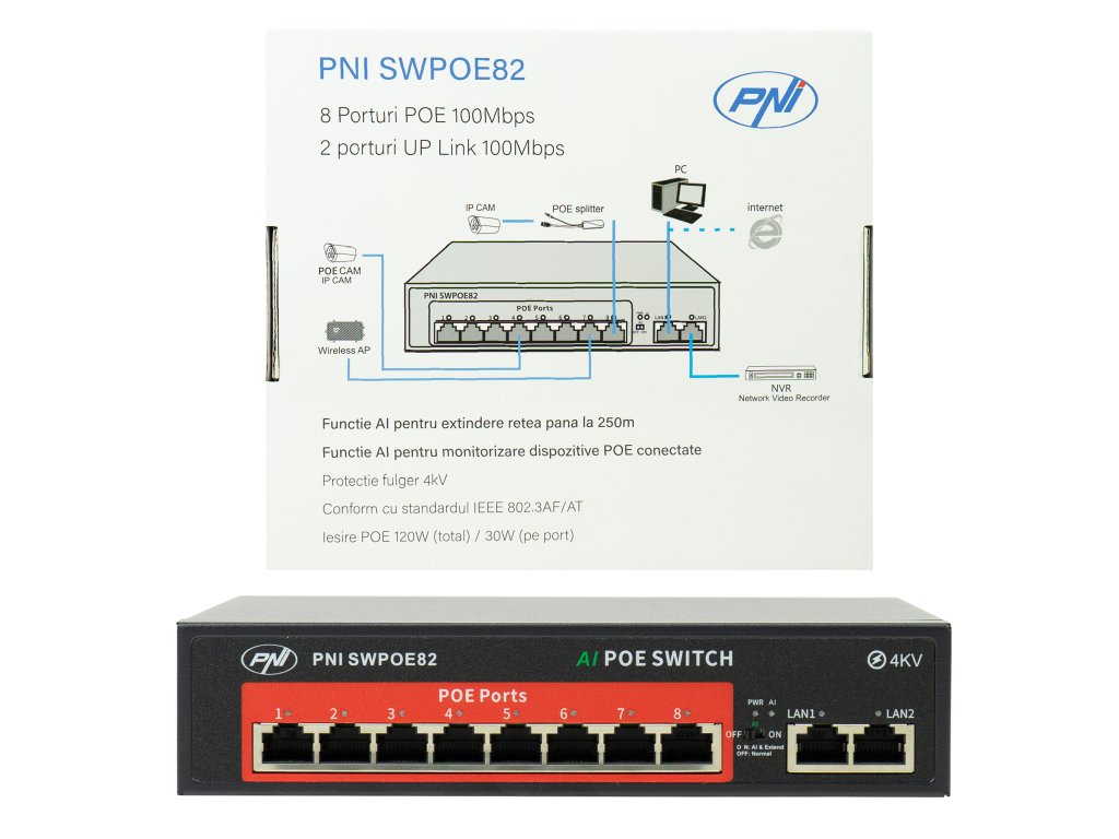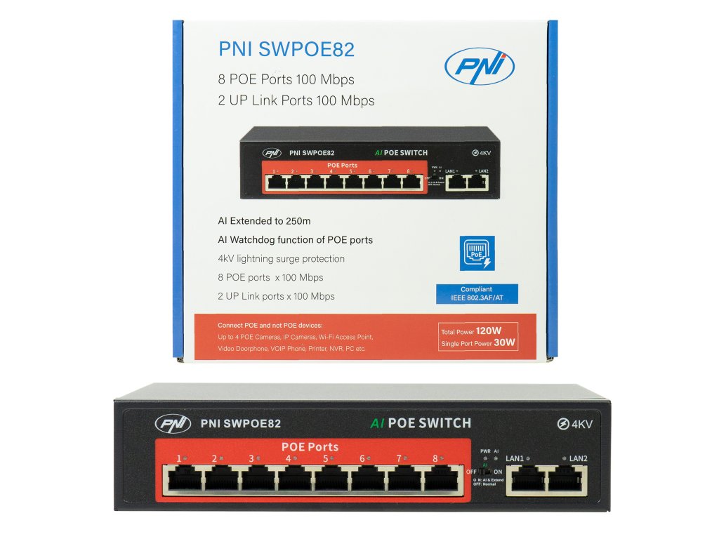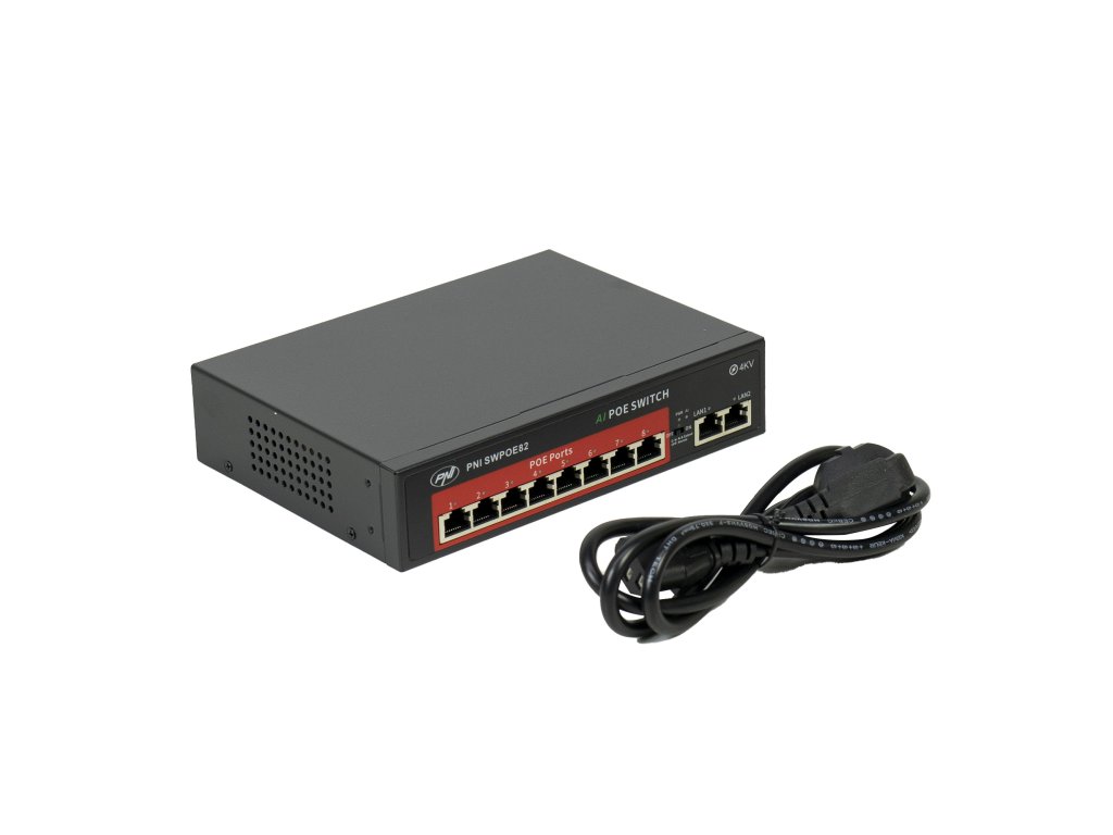 PoE prepínač PNI SWPOE82 8 PoE 100 Mbps portov a 2 UP Link 100 Mbps porty, 120 W, funkcia AI Extend až 250 m, ochrana pred bleskom 4 kV