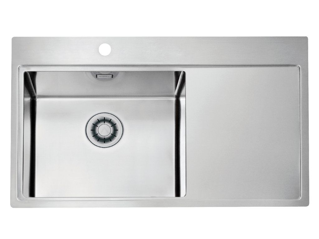 Plně a plošně vestavěný dřez (F/S) Vanička vlevo Provedení : KMB Vyrobeno z nerezové oceli CrNi 18/10 Vnější rozměr: 860x525 mm Odtoková souprava s přepadem a 3 1/2 sítkem, QC Úchyty a těsnění pro upevnění dřezu v balení S otvorem pro baterii Návod pro instalaci v obrázcích na obale Instalace do skříňky o šířce 500 mmDodatočné parametre