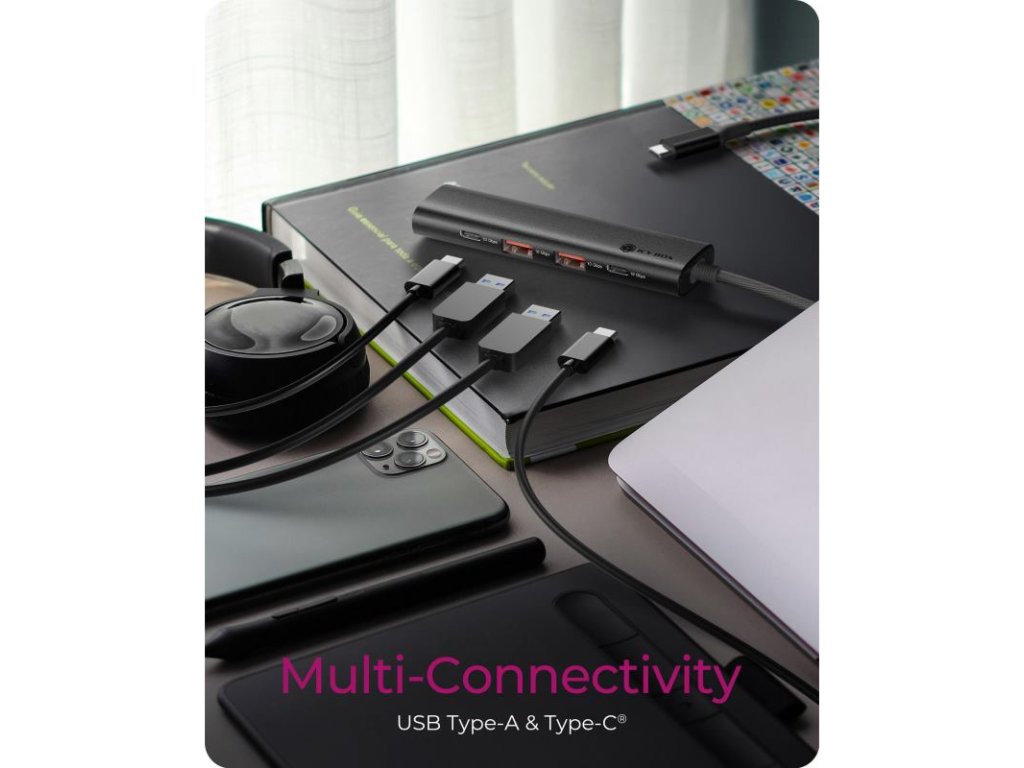 Elegantný Dizajn a Materiály: V čiernom prevedení a vyrobený z kombinácie hliníka a plastu, tento hub je nielen funkčný, ale aj esteticky príjemný a odolný.