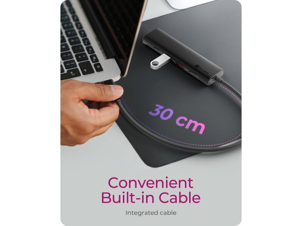 Integrovaný a Odolný Kábel: Zabudnite na zamotané káble. IB-HUB1437-CPD je vybavený 30 cm integrovaným opleteným káblom s textilným plášťom, ktorý zaručuje nielen vysokú odolnosť a dlhú životnosť, ale aj eliminuje potrebu ďalších káblov. Kompaktný dizajn udržuje váš pracovný priestor usporiadaný a ideálny pre cestovanie.