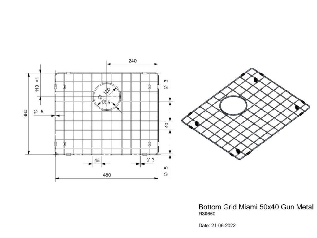 Mriežka do drezu Reginox Miami 50x40 Gun metal (R30660) . Mriežka chráni drez pred opotrebením. Pri používaní drezu nie je potrebné mriežku odstraňovať, voda krásne odteká do odpadu. Gumové nožičky a vonkajšie ohraničenie mriežky zaisťuje pevné uchytenie na dne drezu a drez chráni.