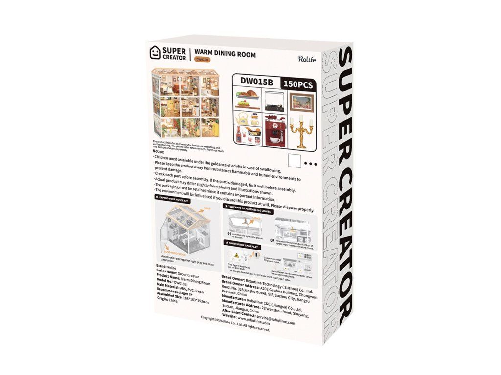 Kuchyňa a jedáleň sú srdcom domova. Pri jedálenskom stole sa stretávame so svojimi najbližšími a pri jedle sa rozprávame o živote, novinkách, svojich zážitkoch. Deň začíname šálkou kávy alebo čaju a raňajkami a pri jedálenskom stole v kruhu rodiny náš deň končí. Tento útulný jedálenský kút v elegantnom vintage štýle v krémovej farbe s priestranným jedálenským stolom je zobrazený do najmenších detailov. Nájdete tu príborník, stôl pokrytý obrusom so 4 stoličkami, pečivo, tanieriky, hrnčeky, kávovar a ďalšie doplnky, ktoré navodzujú atmosféru pokoja a rodinnej pohody, ako sú obrázky na stenách, svietnik či gramofón. Spojením rôznych miniatúr rady Super Creator Series vertikálne alebo horizontálne môžete vytvoriť rôznorodý komplex domčekov. Ochráňte svoj výtvor pomocou krytov proti prachu a nečistotám – DWP05 Dvere proti prachu B a DWP02 Strecha typu B.Skladanie skladačky podporuje rozvoj jemnej motoriky, priestorového myslenia a trpezlivosti. Je to možnosť, ako kombinovať zábavu so vzdelávaním. Všetky presné dieliky do seba ľahko zapadnú, aby výsledok bol stabilný a odolný, a to bez použitia lepidla. Skladačka je dodávaná v nezloženom stave, zabalená v škatuli s podrobným návodom na zostavenie. Hlavné vlastnosti: 150 dielikovdoba skladania 45 minLED osvetleniena napájanie slúži kábel USB-C (je súčasťou balenia)zostavenie bez použitia lepidlaatraktívny vzhľadvhodné pre deti i dospelýchrozvíja logické a motorické zručnostipodporuje trpezlivosť detíideálny ako darček alebo jedinečná dekoráciamožnosť spojenia viacerých miniatúrna dokúpenie kryty proti prachu – DWP05 a DWP02Dodatočné parametre