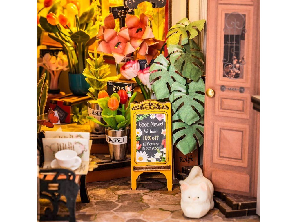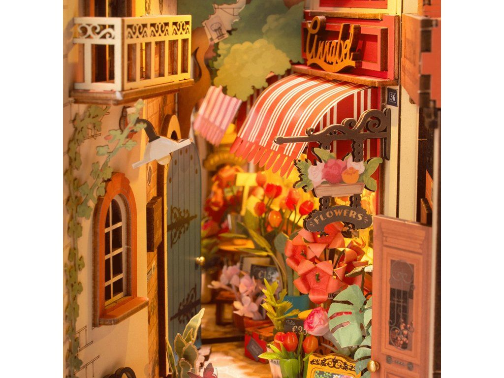 Vytvorte si kúzelnú kvetinovú oázu medzi Vašimi knihami vďaka miniatúrnemu kvetinárstvu. Preneste sa do uličky, v ktorej môžete obdivovať jemné detaily budov, ako sú steny pokryté brečtanom, klenuté okná, prepracované dvere a balkón, pruhované markízy, odpočívajúca mačka a množstvo kvetov. Príjemné LED osvetlenie umocní dojem z tohto prívetivého kvetinového kútika a navodí vo Vašom domove atmosféru pokoja a pohody.Pozvite svoju rodinu alebo priateľov a užite si zábavné tvorenie bez nutnosti použitia lepidla alebo nástrojov. Všetky diely skladačky sú presne vyrezané, očíslované a ľahko do seba zapadnú, aby výsledok bol stabilný a odolný. Plastová fólia ochráni Váš kvetinový kútik z hornej aj prednej strany pred prachom a nečistotami. Dodávané s podrobným návodom na zostavenie. Hlavné vlastnosti: 164 precízne vyrezaných dielikovjednoduchá montáž bez použitia lepidla a nástrojovrozvíja logické a motorické zručnostipodporuje trpezlivosť detíideálny ako darček alebo jedinečná dekoráciaLED osvetleniepodrobný návod na zostavenie súčasťou baleniavyžaduje 2 kusy batérií AAA/LR03/AM4 1,5V - nie sú súčasťou baleniaDodatočné parametre