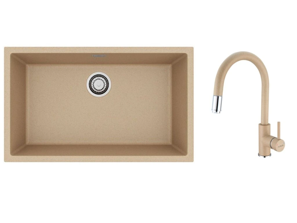 Vestavěný dřez, univerzál. Provedení : granitový dřez bez odkapu Vnější rozměr: 750 x 450 mm Rozměr vaničky: 700 x 400 x 198 mm Sítkový ventil 3 1/2, sifon pro úsporu místa s odbočkou na myčku Úchyty a těsnění pro upevnění dřezu v balení Návod pro instalaci v obrázcích na obale Instalace vrchní I montáž nebo spodní U, velikost skříňky 800 mm Rozměry balení ( mm ): 575 x 880 x 270 mm Váha netto: 13,7 kg Vysokotlaká baterie otočné ramínko vytahovací sprška rozměr:207 x 380 mm provedení: barevný nástřikDodatočné parametre