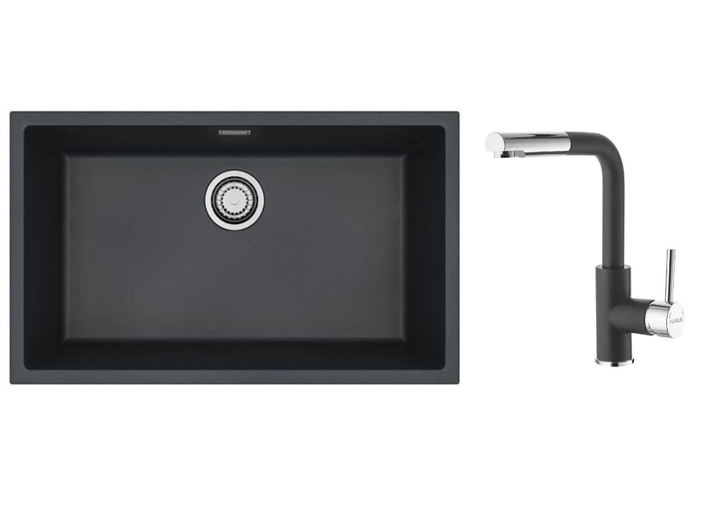 Vestavěný dřez, univerzál. Provedení : granitový dřez bez odkapu Vnější rozměr: 750 x 450 mm Rozměr vaničky: 700 x 400 x 198 mm Sítkový ventil 3 1/2, sifon pro úsporu místa s odbočkou na myčku Úchyty a těsnění pro upevnění dřezu v balení Návod pro instalaci v obrázcích na obale Instalace vrchní I montáž nebo spodní U, velikost skříňky 800 mm Rozměry balení ( mm ): 575 x 880 x 270 mm Váha netto: 13,7 kg Vysokotlaká baterie otočné ramínko vytahovací sprška rozměr:206 x 268 mm provedení: barevný nástřikDodatočné parametre