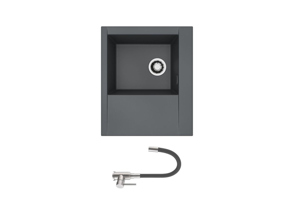 Vestavěný dřez, levý Provedení : granitový dřez s krátkým odkapem Vnější rozměr: 615 mm x 515 mm Rozměr vaničky: 340 x 400 x 198 mm Sítkový ventil 3 1/2 s přepadem, sifon pro úsporu místa s odbočkou na myčku Úchyty pro upevnění dřezu v balení Předfrézované otvory pro baterii Návod pro instalaci v obrázcích v balení Instalace do skříňky při montáži: I- o šířce 450 mm Váha: 12,5 kg Vysokotlaká baterie otočné ohybné ramínko rozměr:210 x 340 mm (š x v) provedení: barevný nástřik Dřezová baterie se silikonovým ramínkem je praktickým pomocníkem do každé kuchyně. Díky flexibilnímu ramínku si nastavíte proud přesně do místa, kam potřebujete. Po spuštění vody, ramínko nemusíte držet, protože flexi ramínko bude držet proud stále ve stejné nastavené poloze. Dřezová baterie je vyrobena z kvalitních komponentů - srdcem baterie je keramická kartuše. Baterie vybavena plastovým perlátorem, který zajistí jednak provzdušnění proudu a také se oproti kovovým perlátorům snáze čistí od usazenin vodního kamene. Délka hadiček: 40 cm, připojení G 3/8Dodatočné parametre