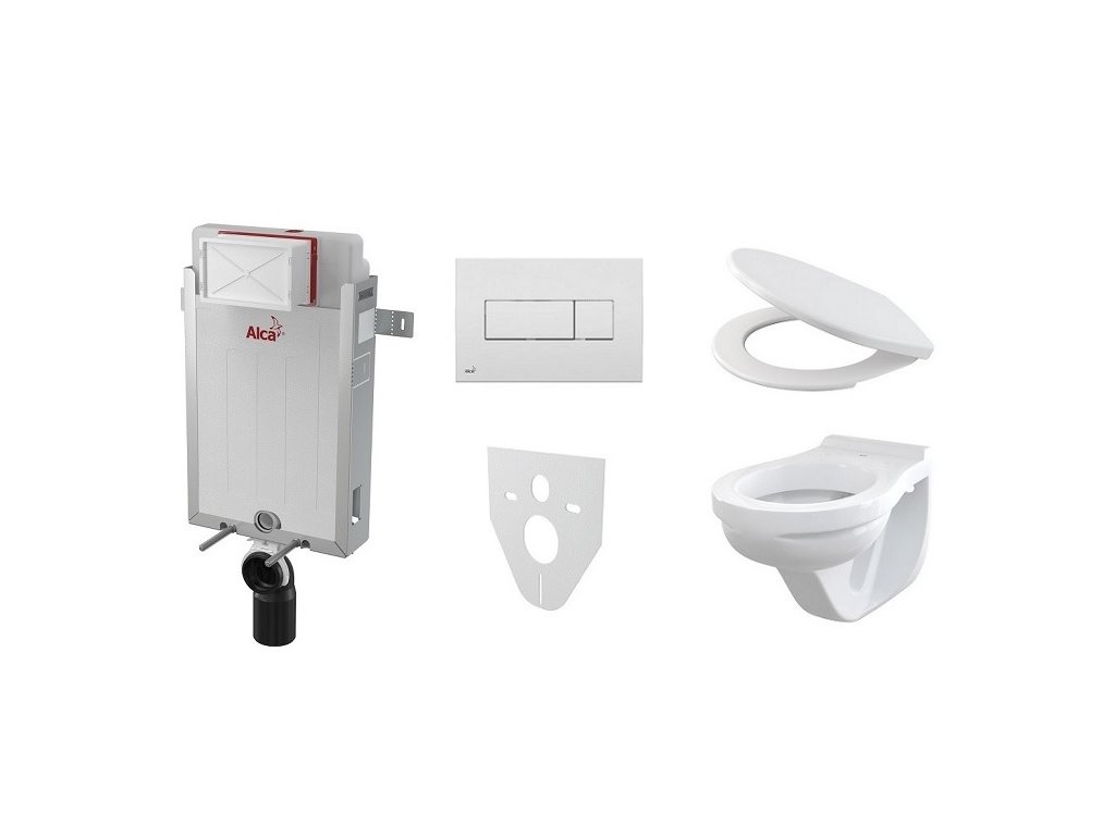 <p class="MsoNormal" style="margin-bottom: .0001pt; line-height: normal;"><span style="font-size: 10.5pt; font-family: 'Verdana','sans-serif'; mso-fareast-font-family: 'Times New Roman'; mso-bidi-font-family: Calibri; color: black; mso-fareast-language: SK;">SET sa skladá z nasledujúcich kompomentov:<br /><br /><strong style="mso-bidi-font-weight: normal;">• predstenový inštalačný systém pre zamurovanie Alcamodul, AM115/1000, s dávkovačom tabliet.<br /></strong></span></p> <p class="MsoNormal" style="margin-bottom: .0001pt; line-height: normal;"><span style="font-size: 10.5pt; font-family: 'Verdana','sans-serif'; mso-fareast-font-family: 'Times New Roman'; mso-bidi-font-family: Calibri; color: black; mso-fareast-language: SK;"><em style="mso-bidi-font-style: normal;">Použitie:<br /></em>Pre závesné WC<br />Pre zamurovanie a obmurovanie k nosnej stene - mokrý proces, stavebná hĺbka len 86 mm<br />Vhodné pre rekonštrukcie<br />Pre montáž závesného WC s pripojovacím rozstupom 180 mm alebo 230 mm<br /></span></p> <p class="MsoNormal" style="margin-bottom: .0001pt; line-height: normal;"><span style="font-size: 10.5pt; font-family: 'Verdana','sans-serif'; mso-fareast-font-family: 'Times New Roman'; mso-bidi-font-family: Calibri; color: black; mso-fareast-language: SK;"><em style="mso-bidi-font-style: normal;">Vlastnosti:<br /></em>Posuvný mechanizmus držiaka odpadu v ôsmich polohách vo vzdialenosti 0–93 mm<br />Rohový ventil s možnosťou na napojenie na potrubný systém Mepla<br />Technické riešenie umožňuje ukotvenie do nerovného povrchu vysekaného do steny bez nutnosti zarovnania zadnej steny v rozsahu 50 mm<br />Pozinkovaná nosná konštrukcia so štyrmi výklopnými držiakmi pre jednoduchú inštaláciu<br />Konštrukcia polystyrénovej izolácie zabraňuje roseniu na povrchu nádržky a tlmí prestup vibrácií z nádržky do stavebnej konštrukcie<br />Duálne splachovanie nezávisle nastaviteľné s hygienickou rezervou<br />Kompatibilné so všetkými ovládacími tlačítkami Alcadrain<br />Servisné práce bez použitia náradia<br />Prívod vody zozadu/zhora uprostred<br />Vyberateľný diel polystyrénu pre ľahký prístup pri inštalácii<br />Nádržka je z vyrobená z jedného kusu, čím je zaručená 100% nepriepustnosť<br />Kryt servisného otvoru zjednodušuje montáž a bráni prenikaniu vlhkosti a nečistôt<br />Montážna výška 1070 mm<br />Montážna hĺbka nastaviteľná v rozmedzí 20–60 mm<br />Stavebná hĺbka 86 mm, s odpadovým kolenom 125 mm<br />Materiál nosnej konštrukcie: pozinkovaný kov<br /></span></p> <p class="MsoNormal" style="margin-bottom: .0001pt; line-height: normal;"><span style="font-size: 10.5pt; font-family: 'Verdana','sans-serif'; mso-fareast-font-family: 'Times New Roman'; mso-bidi-font-family: Calibri; color: black; mso-fareast-language: SK;"><em style="mso-bidi-font-style: normal;">Rozsah dodávky:<br /></em>Nádrž s napúšťacou a vypúšťacou armatúrou<br />Pozinkovaný rám vrátane nosnej konštrukcie<br />Šróbovanie 1/2" pre pripojenie vody s integrovaným rohovým ventilom Schell 1/2–3/8"<br />Fixačný materiál: vrut Ø8×60 mm – 4 ks, hmoždinka Ø12 mm – 4 ks<br />Fixačný set pre uchytenie WC misy: závitová tyč M12 – 2 ks, podložky – 4 ks, krytka – 2 ks, matica – 2 ks, chránička závitu – 2 ks<br />Koleno odpadu HT90 / 90/110 polypropylén<br />Tesnenie prívodu, vývodka polypropylén, vrapová vložka<br />Tesnenie odpadu, prepojka polypropylén, tesnenie prepojky<br />Sada inštalačných krytiek pre ochranu pripojovacích otvorov pri montáži systému<br />Kryt servisného otvoru dvojdielny, jednoducho skrátiteľný<br /></span></p> <p class="MsoNormal" style="margin-bottom: .0001pt; line-height: normal;"><span style="font-size: 10.5pt; font-family: 'Verdana','sans-serif'; mso-fareast-font-family: 'Times New Roman'; mso-bidi-font-family: Calibri; color: black; mso-fareast-language: SK;"><em style="mso-bidi-font-style: normal;">Technické parametre:<br /></em>Pripojenie vody zozadu alebo zhora montážnymi otvormi: G1/2 "<br />Funkčný rozsah tlaku vody: 0,05 – 0,8 Mpa<br />Odporúčaný rozsah tlaku vody: 0,3 – 0,5 Mpa<br />Štandardné nastavenie veľkého spláchnutia: 6 l<br />Štandardné nastavenie malého spláchnutia: 3 l<br />Hygienická rezerva: 3 l<br />Objem vody v nádržke: 9 l<br />Záťažová skúška: 400 kg<br /></span></p> <p class="MsoNormal" style="margin-bottom: .0001pt; line-height: normal;"><span style="font-size: 10.5pt; font-family: 'Verdana','sans-serif'; mso-fareast-font-family: 'Times New Roman'; mso-bidi-font-family: Calibri; color: black; mso-fareast-language: SK;"><strong style="mso-bidi-font-weight: normal;">• biele plastové ovládacie tlačidlo pre predstenové inštalačné systémy, M370<br /></strong></span></p> <p class="MsoNormal" style="margin-bottom: .0001pt; line-height: normal;"><span style="font-size: 10.5pt; font-family: 'Verdana','sans-serif'; mso-fareast-font-family: 'Times New Roman'; mso-bidi-font-family: Calibri; color: black; mso-fareast-language: SK;"><em style="mso-bidi-font-style: normal;">Vlastnosti:<br /></em>Dvojčinné mechanické splachovanie<br />Kompatibilný pre všetky predstenové inštalačné systémy a nádržky pre zamurovanie Alcaplast<br />Povrchová úprava: biela<br />Materiál: plast<br /></span></p> <p class="MsoNormal" style="margin-bottom: .0001pt; line-height: normal;"><span style="font-size: 10.5pt; font-family: 'Verdana','sans-serif'; mso-fareast-font-family: 'Times New Roman'; mso-bidi-font-family: Calibri; color: black; mso-fareast-language: SK;"><strong style="mso-bidi-font-weight: normal;">• WC Keramin<br /></strong></span></p> <p class="MsoNormal" style="margin-bottom: .0001pt; line-height: normal;"><span style="font-size: 10.5pt; font-family: 'Verdana','sans-serif'; mso-fareast-font-family: 'Times New Roman'; mso-bidi-font-family: Calibri; color: black; ms