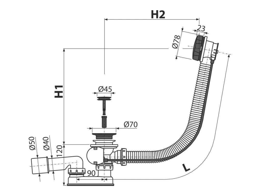 Sifón vaňový automat komplet, dĺžka 570mm, čierna matná